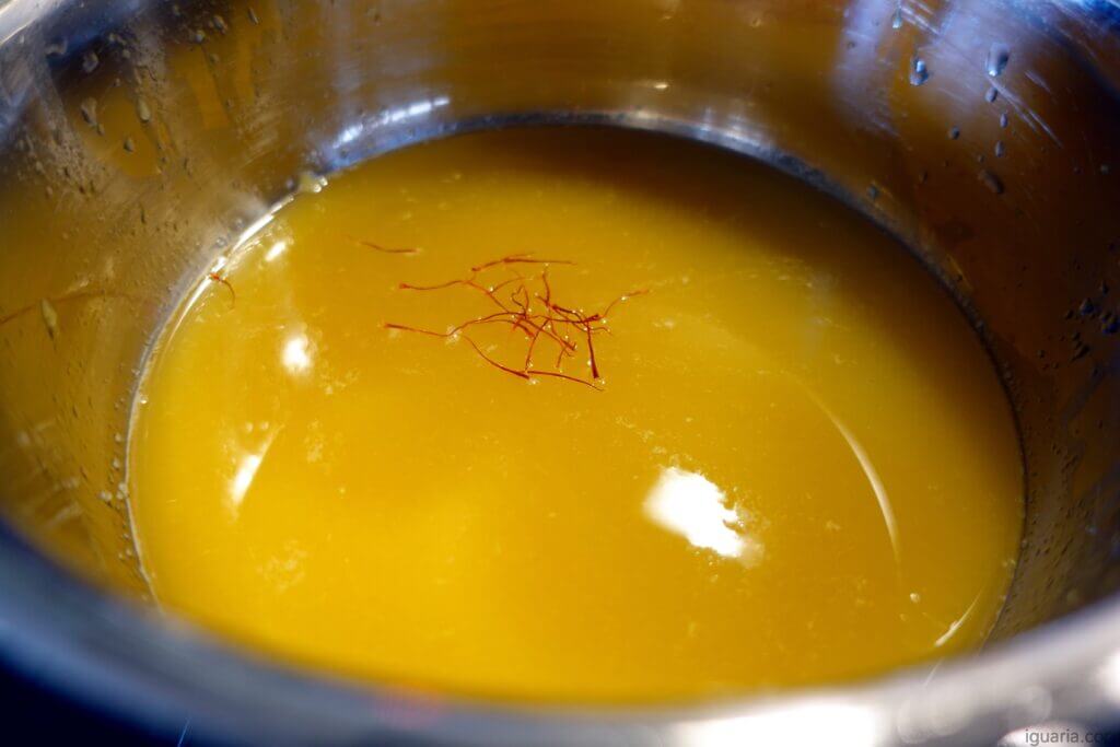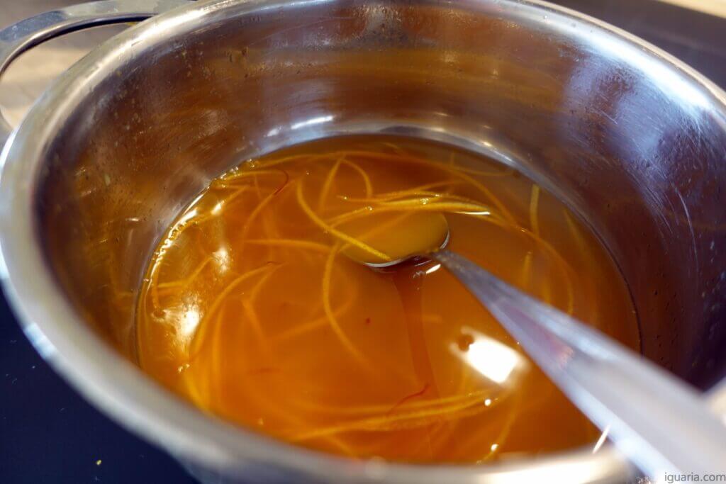 - Num tacho pequeno, junta o sumo das duas laranjas, sumo de meio limão, 125gr de açúcar, uma pitada de açafrão e duas colheres de sopa de água.