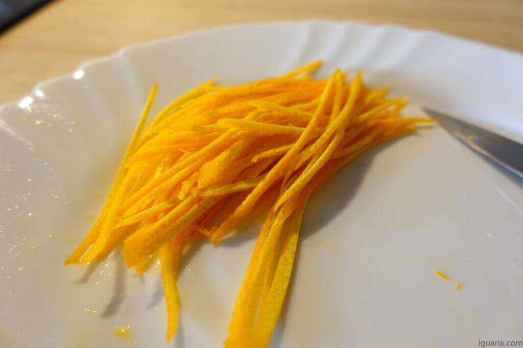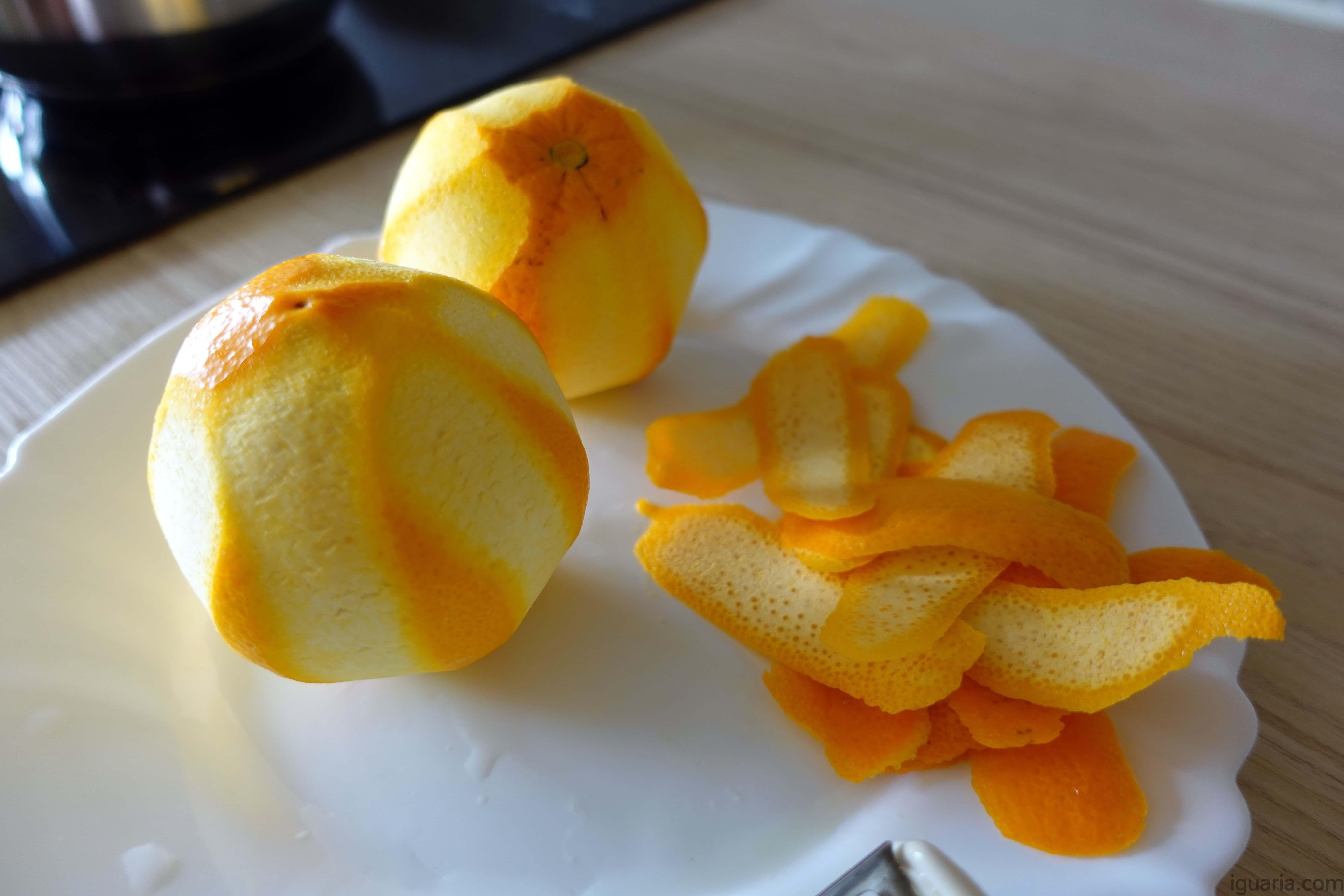 - Enquanto o bolo está no forno, faz a calda de açúcar com açafrão e laranja, lava as duas laranjas e usa um descascador para retirar toda a casca, corta esta numa juliana fininha.
