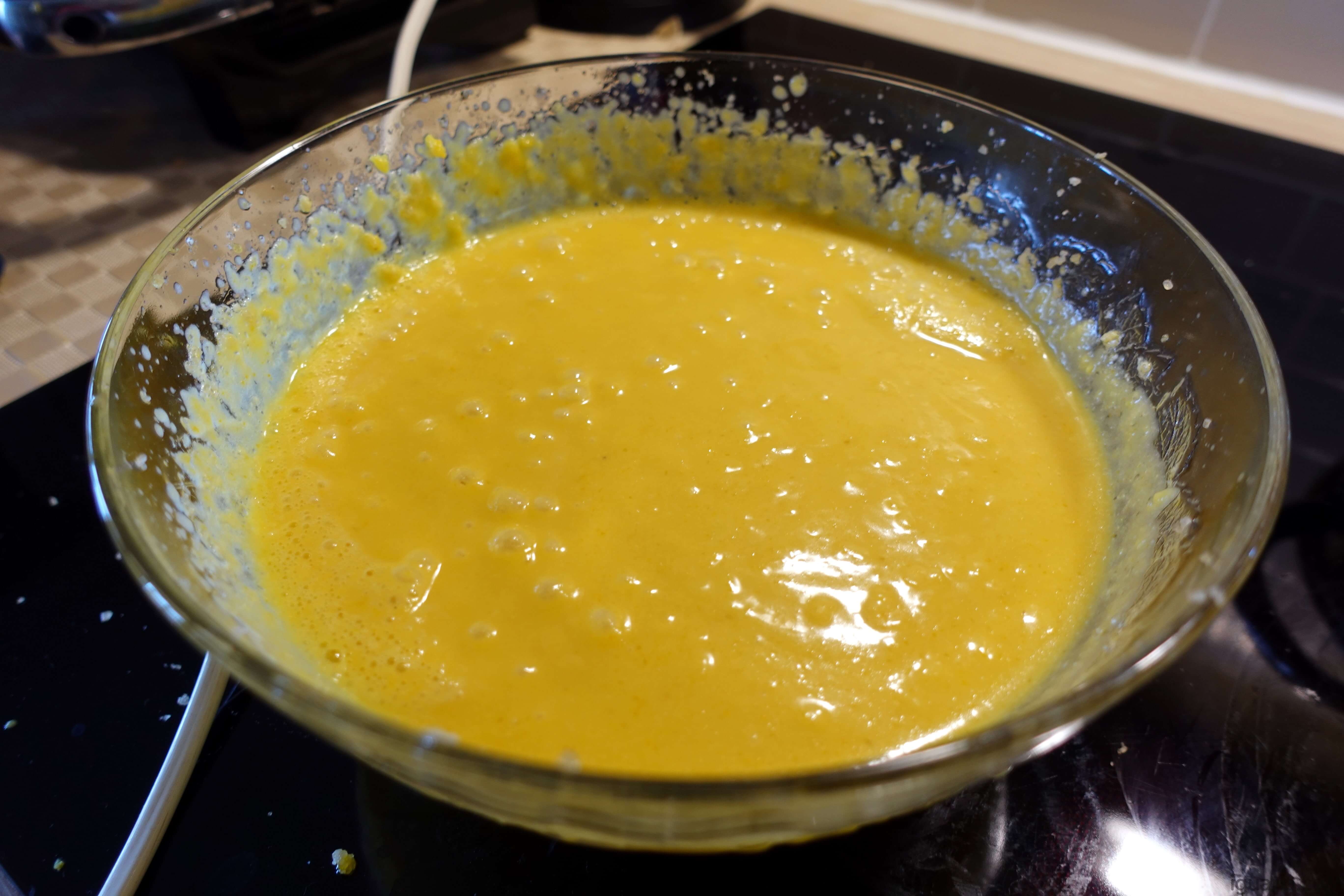 - Numa tigela bate a manteiga a temperatura ambiente com o açúcar até obteres uma mistura esbranquiçada.