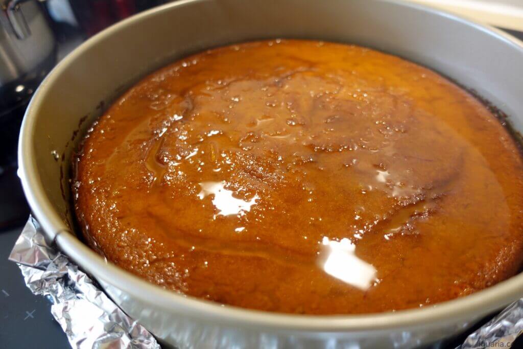 - Quando o bolo sair do forno usa um garfo para picar todo o topo do bolo, depois deita a calda por cima lentamente, deixando o bolo absorver (o ideal é fazer isto com o bolo ainda dentro da forma, só para não escorrer), vai vertendo aos poucos até não teres mais calda.
