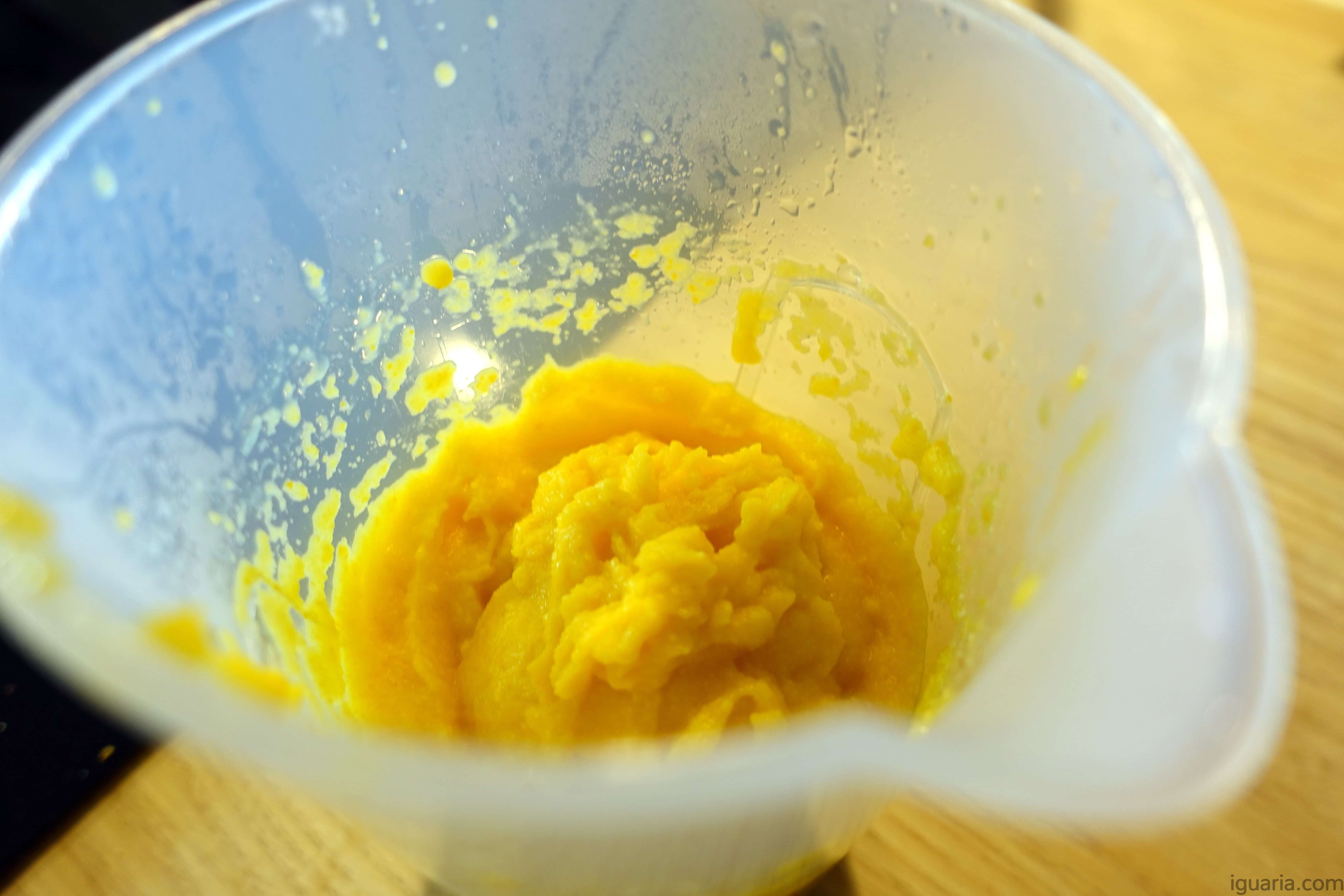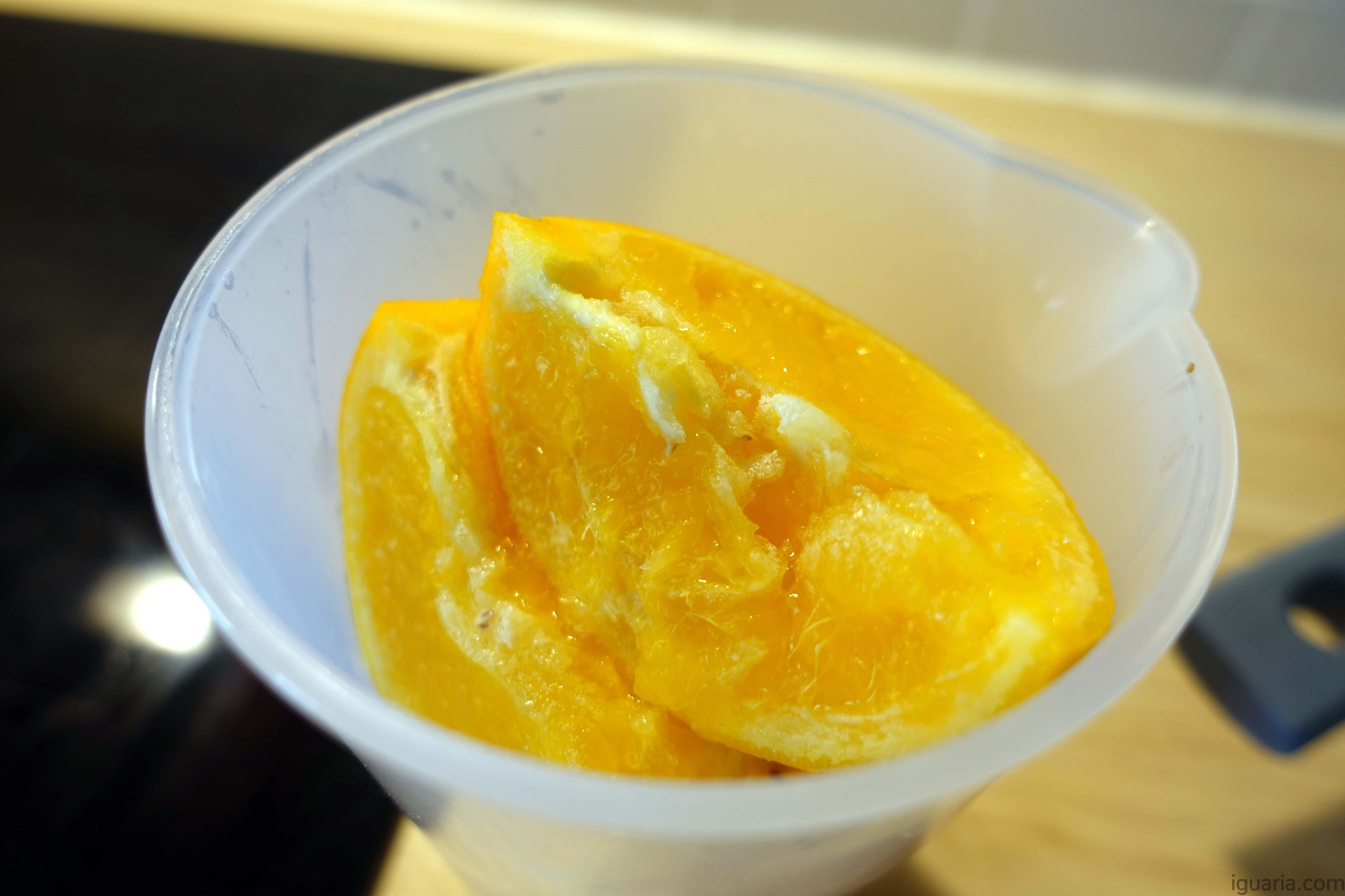 - Retira as laranjas do lume, deixa escorrer e arrefecer, depois corta em pedaços, tira os caroços e depois tritura tudo, casca e polpa até obter uma pasta homogénea.