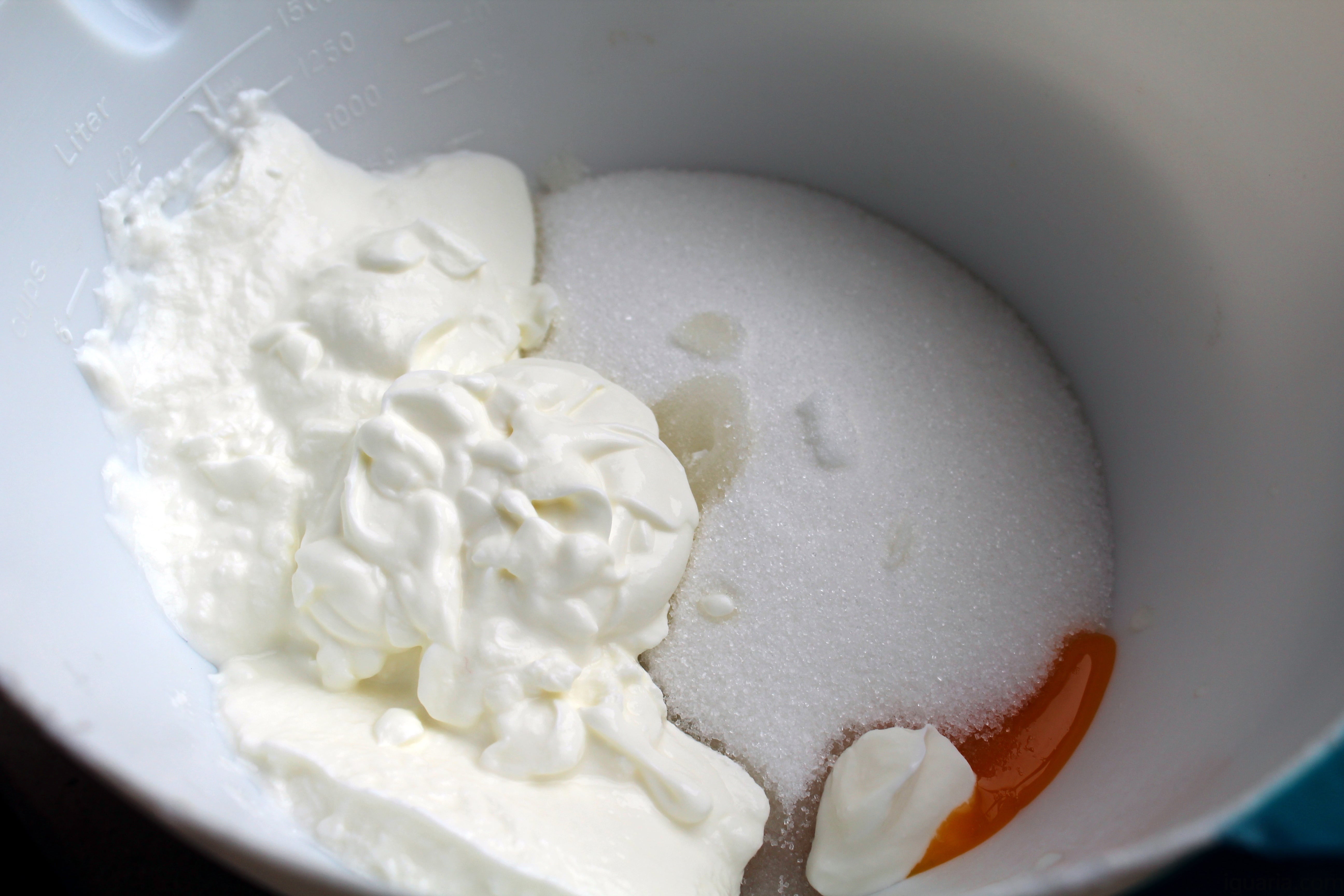 - Numa tigela junta os iogurtes com o açúcar, seguido de 2 ovos e 3 gemas, bate até ficar tudo cremoso, adiciona depois a farinha e fermento peneirado, mistura.