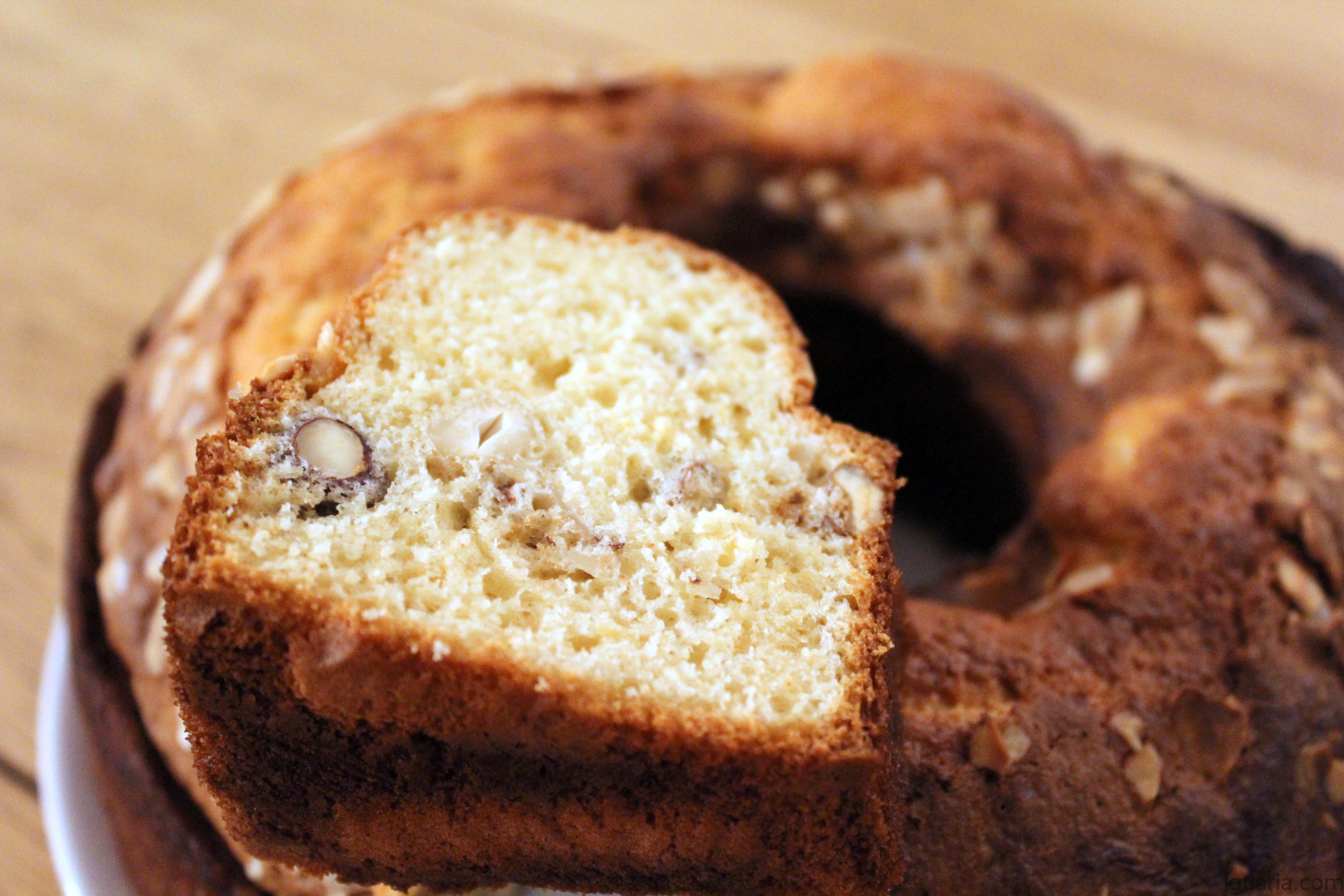Bolo fofinho de iogurte recheado de frutos secos e coberto de amêndoas, perfeito para o Natal.