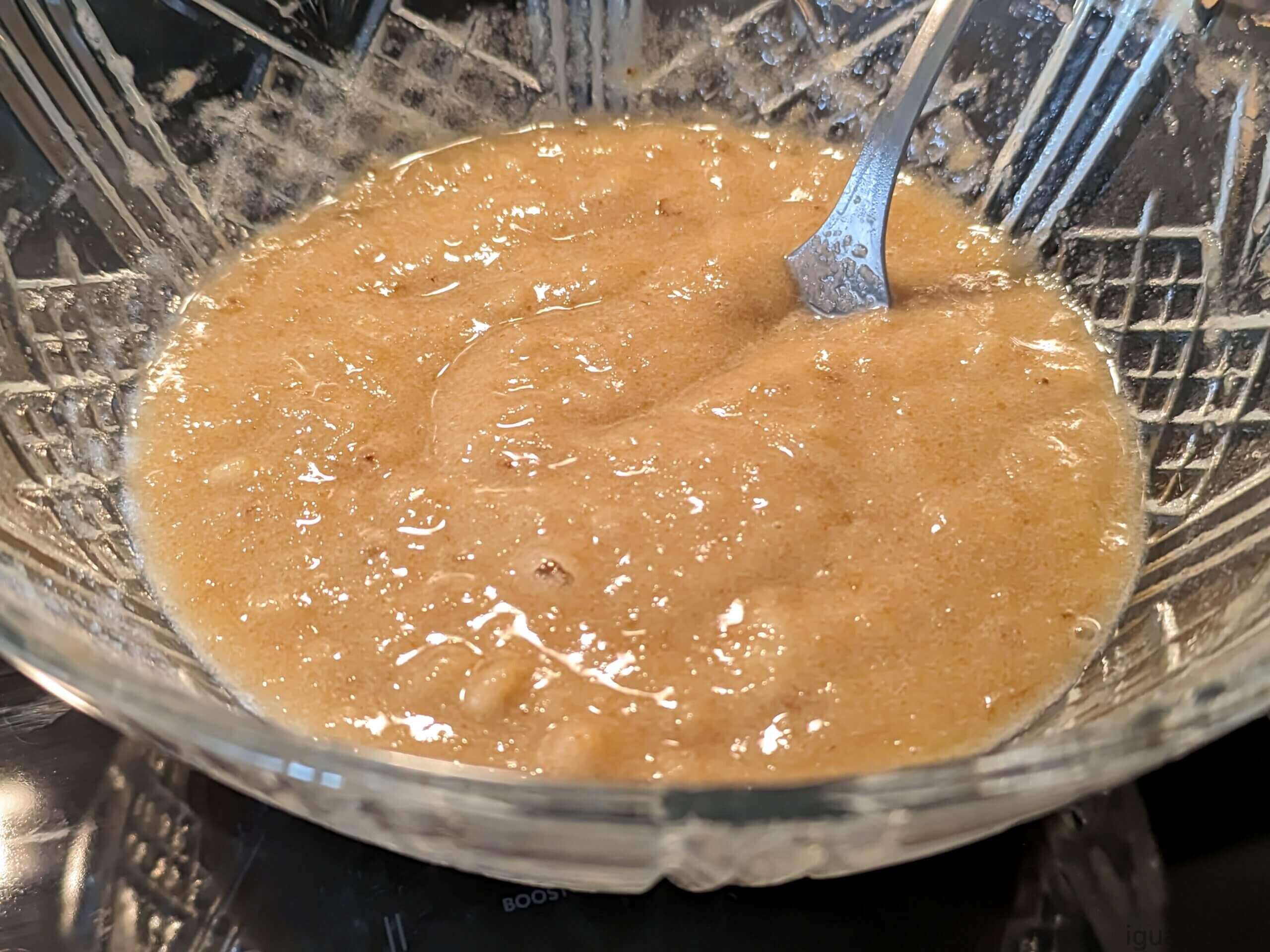 - Junta então a mistura de açúcar com a mistura do puré de banana, mistura até ficar tudo bem integrado, adiciona então a mistura da farinha, envolve tudo até teres uma massa homogénea.