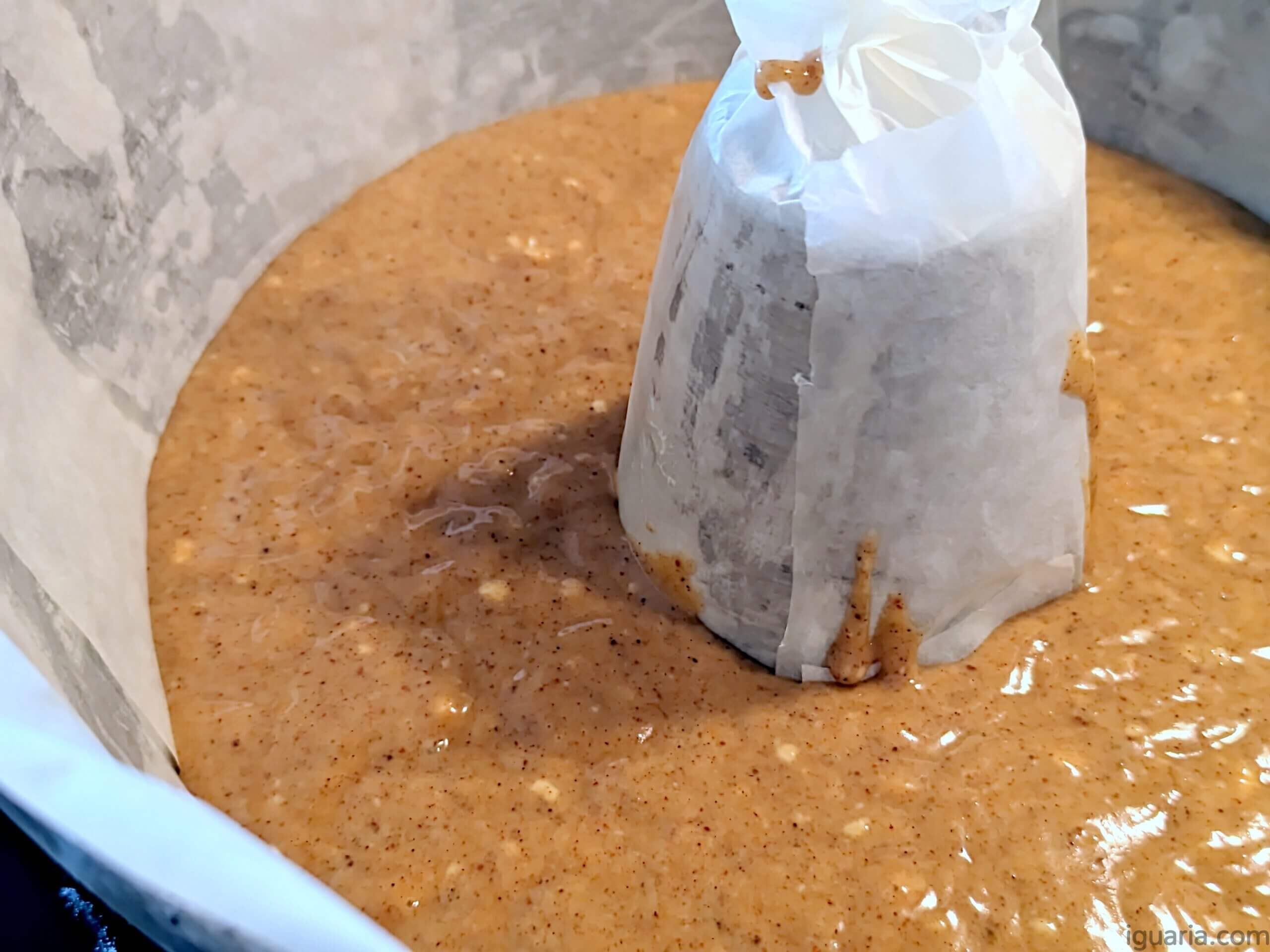 - Leva a assar por entre 1 hora a 1 hora e 15 minutos, se o topo começar a ficar demasiado queimado, cobre com folha de alumínio para proteger, como sempre, pica com um palito no centro do bolo (ou neste caso na parte mais alta) se o palito/garfo sair seco então o bolo está pronto, retira do forno.