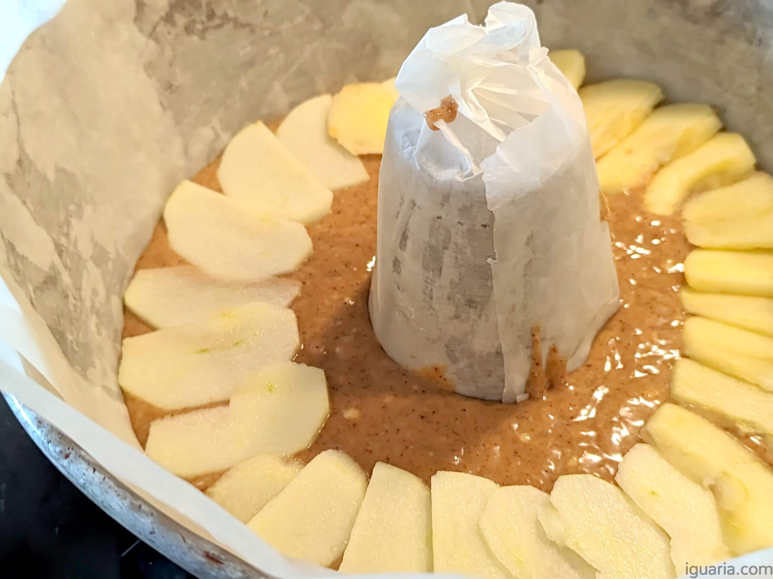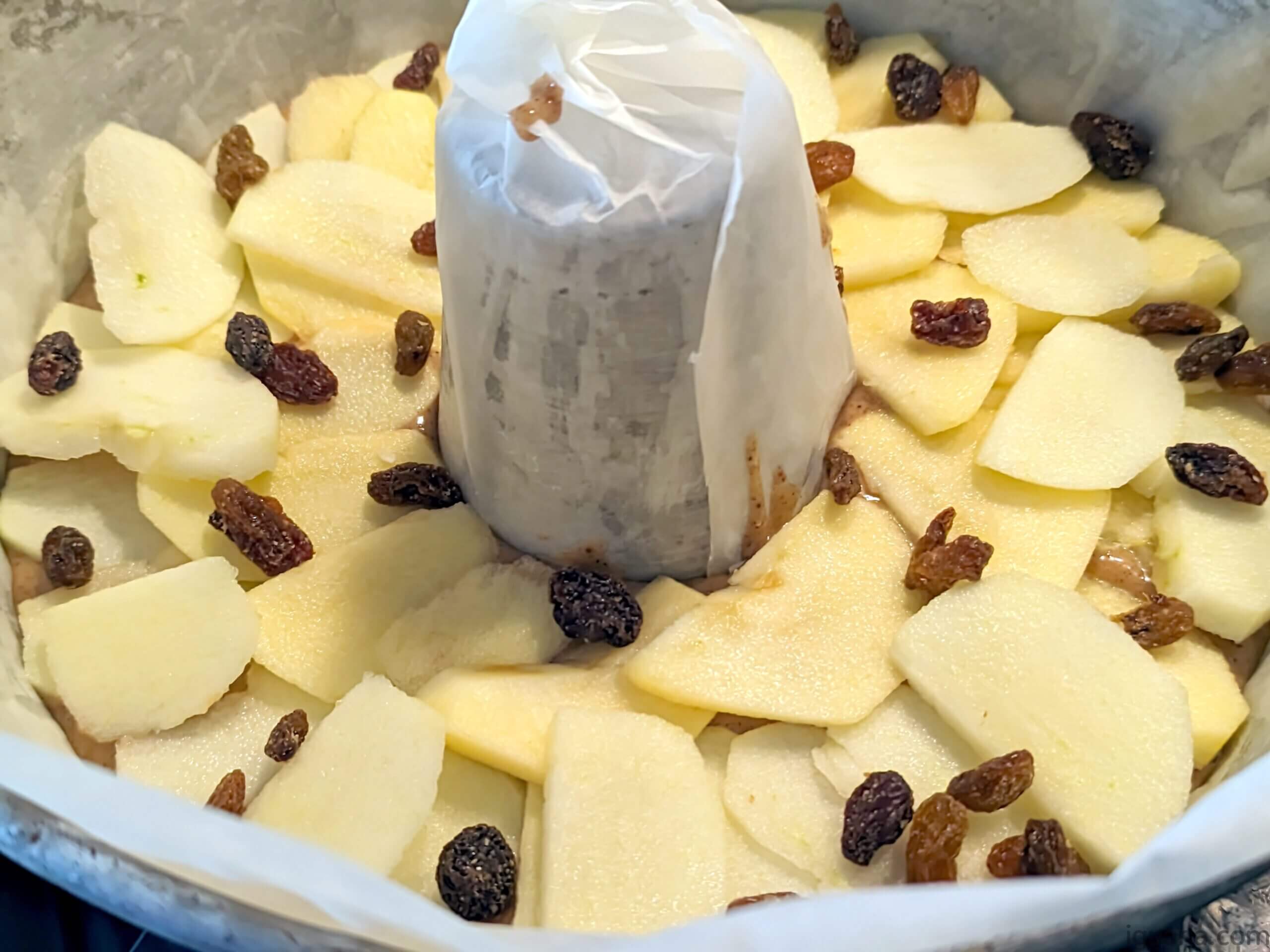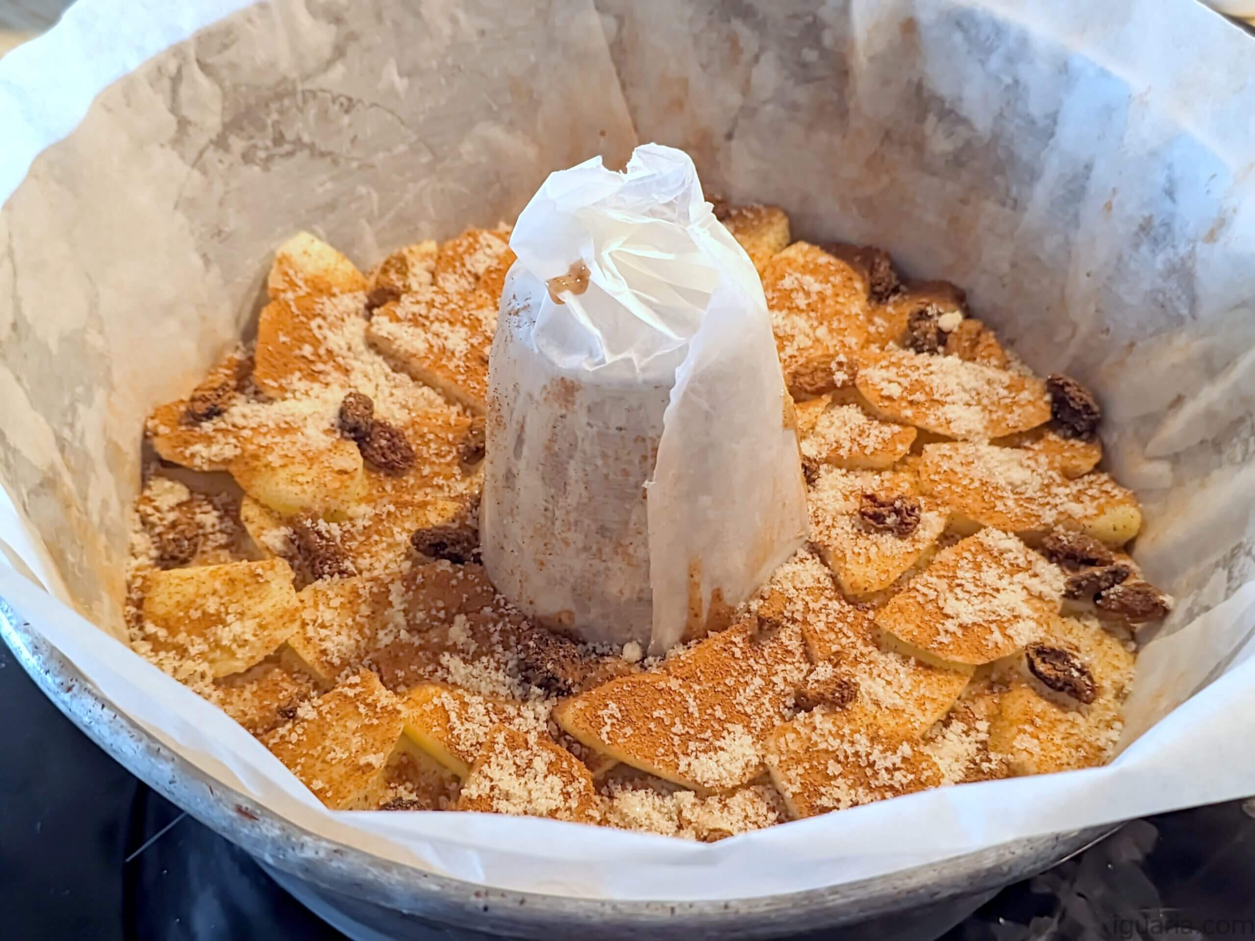 6 Por fim, adiciona a canela, noz moscada, gengibre em pó, cardamomo, cominhos e carvo-da-india, envolve mais um pouco e deita na forma, cobre generosamente com as maçãs fatiadas finamente e as passas (retira da água para papel de cozinha para retirar o excesso de água) e polvilha tudo com açúcar amarelo e mais canela.