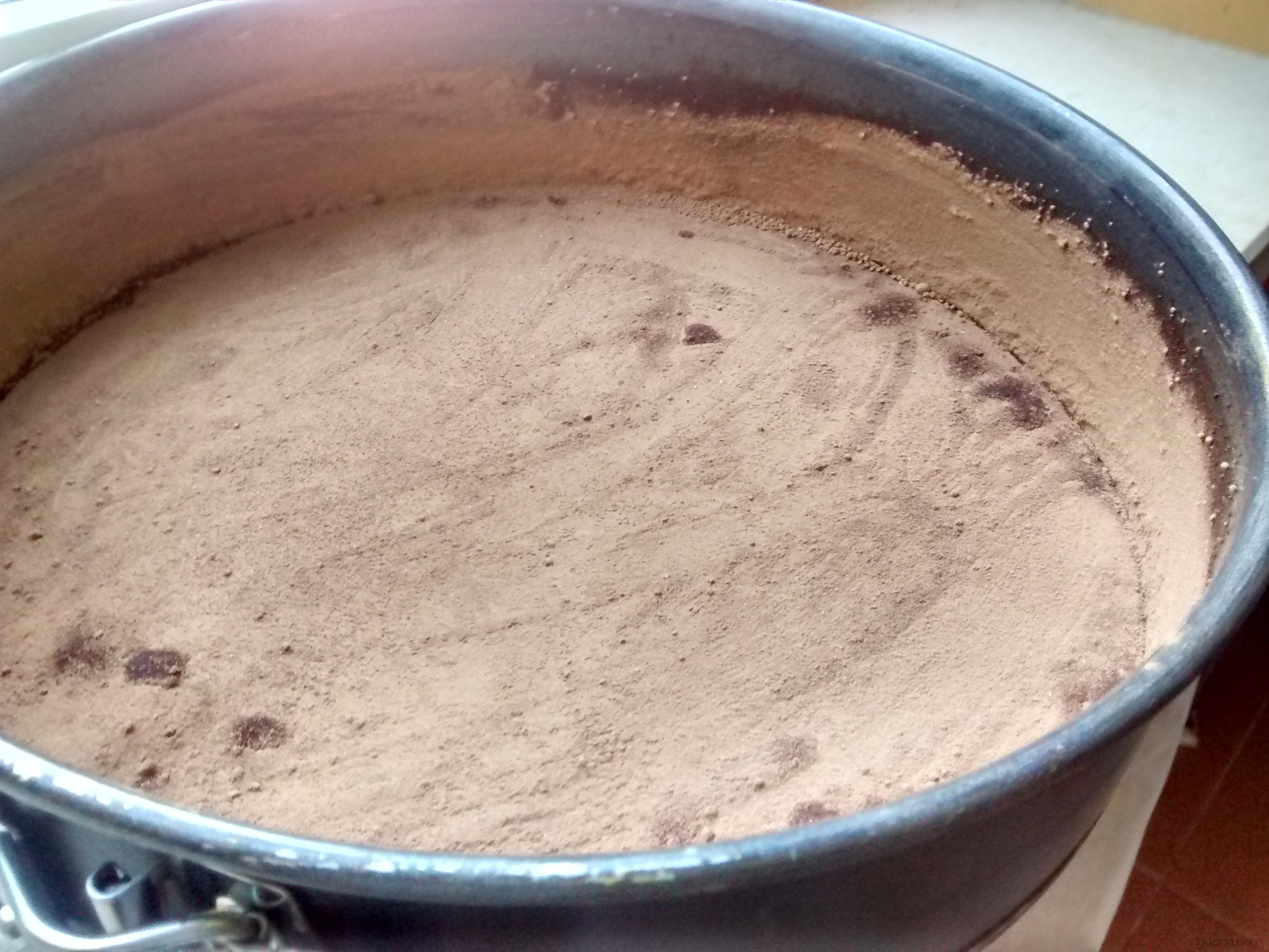 - Começa por pré-aquecer o forno a 180ºC e forra uma forma circular com papel vegetal no fundo e depois os lados e fundo untados de manteiga e polvilhados com cacau.
