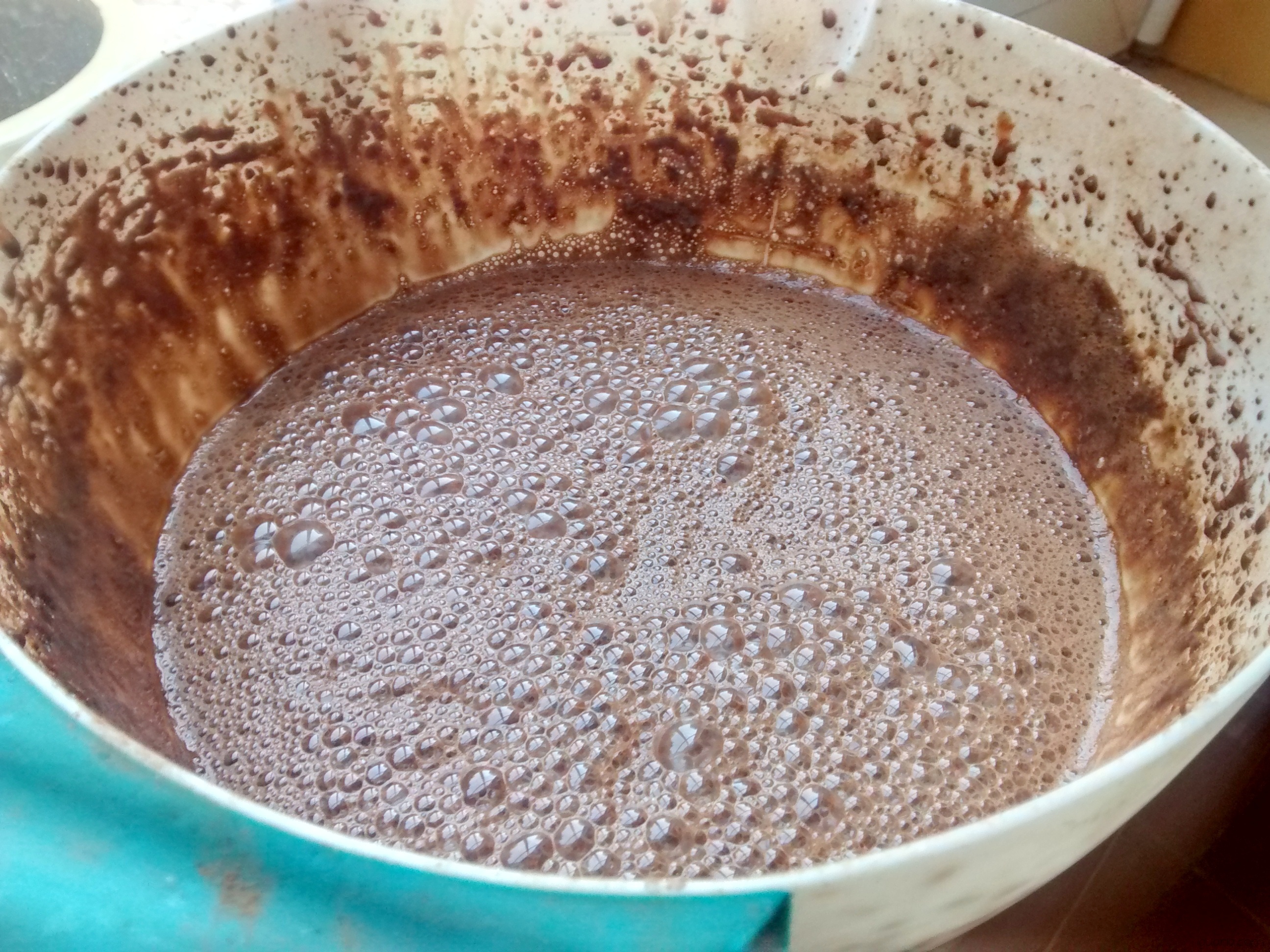- Para a cobertura aquece as natas no microondas dentro de um taça (para não ferver, aquece 1 min de cada vez até elas estarem bem quentes), depois parte o chocolate e deita este sobre as natas seguido de uma pitada de sal, depois mexe bem até o chocolate estar todo bem derretido.