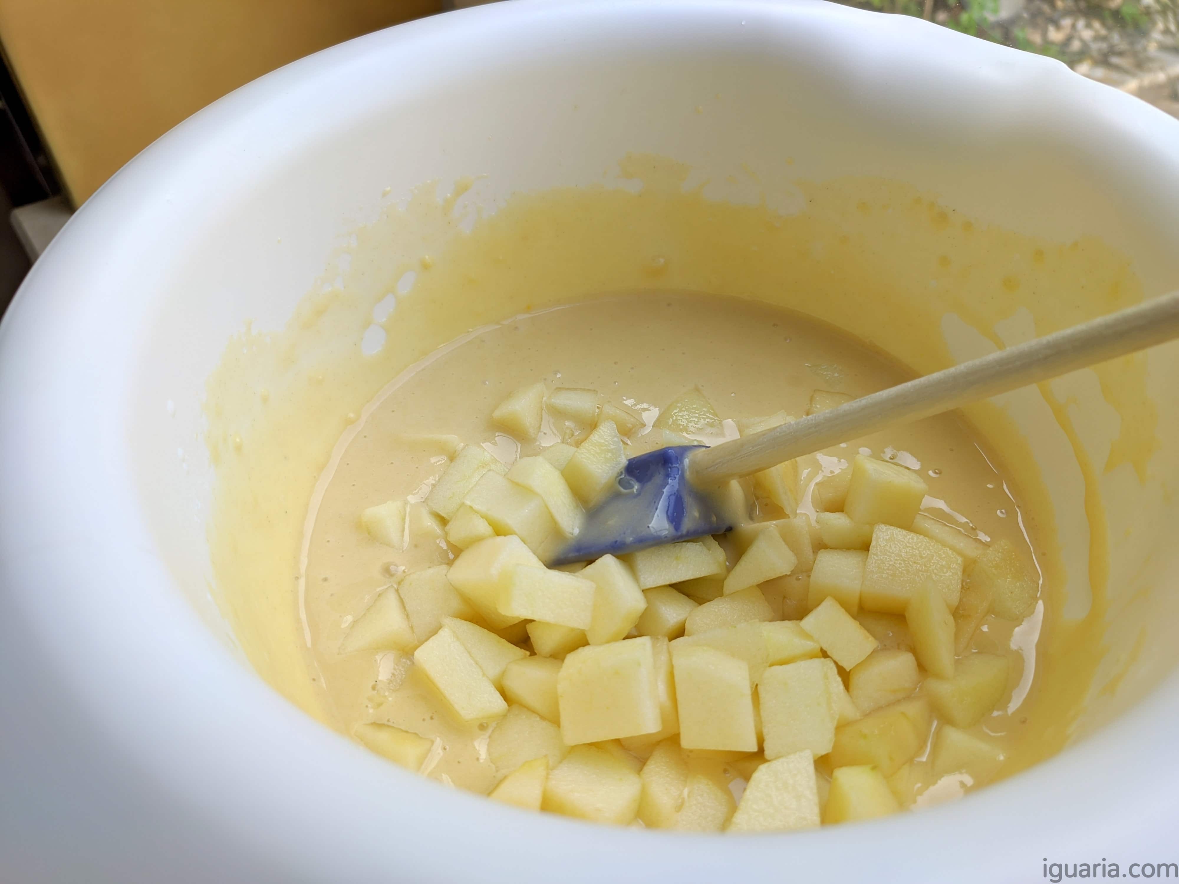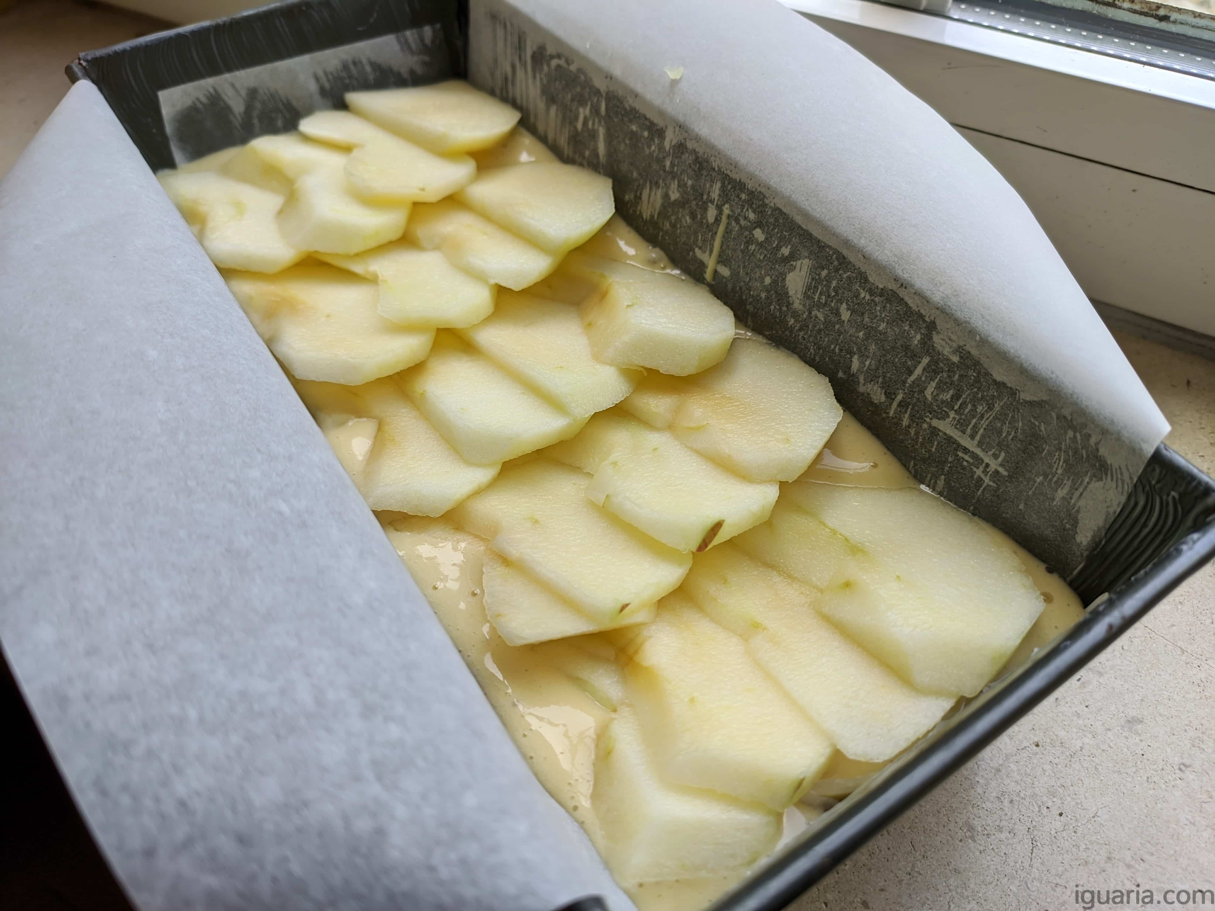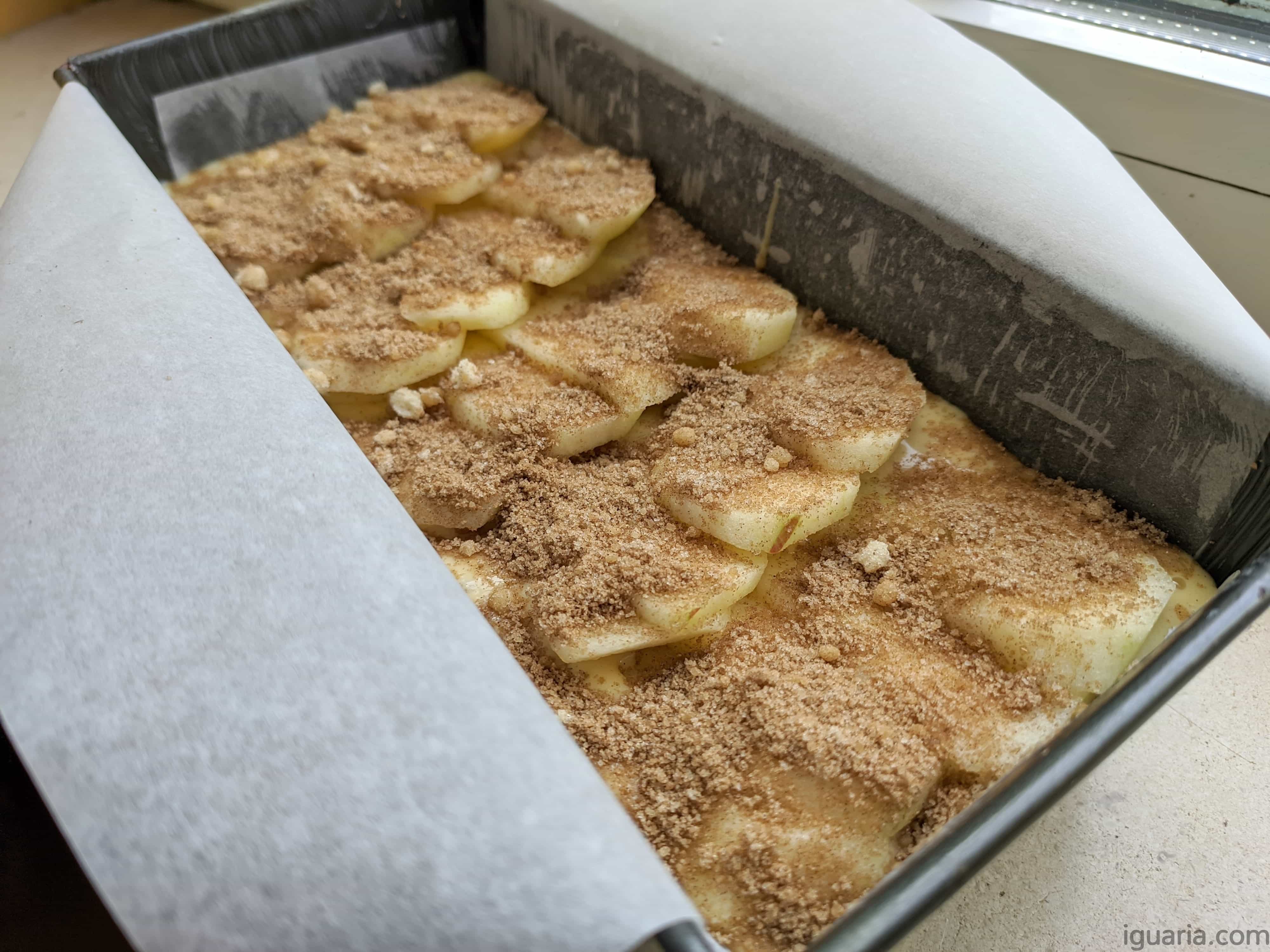 - Junta então a maçã picada em cubos pequenos a massa, mistura e deita na forma, cobre então a forma com a maçã em fatias, polvilha generosamente com açúcar amarelo e canela.