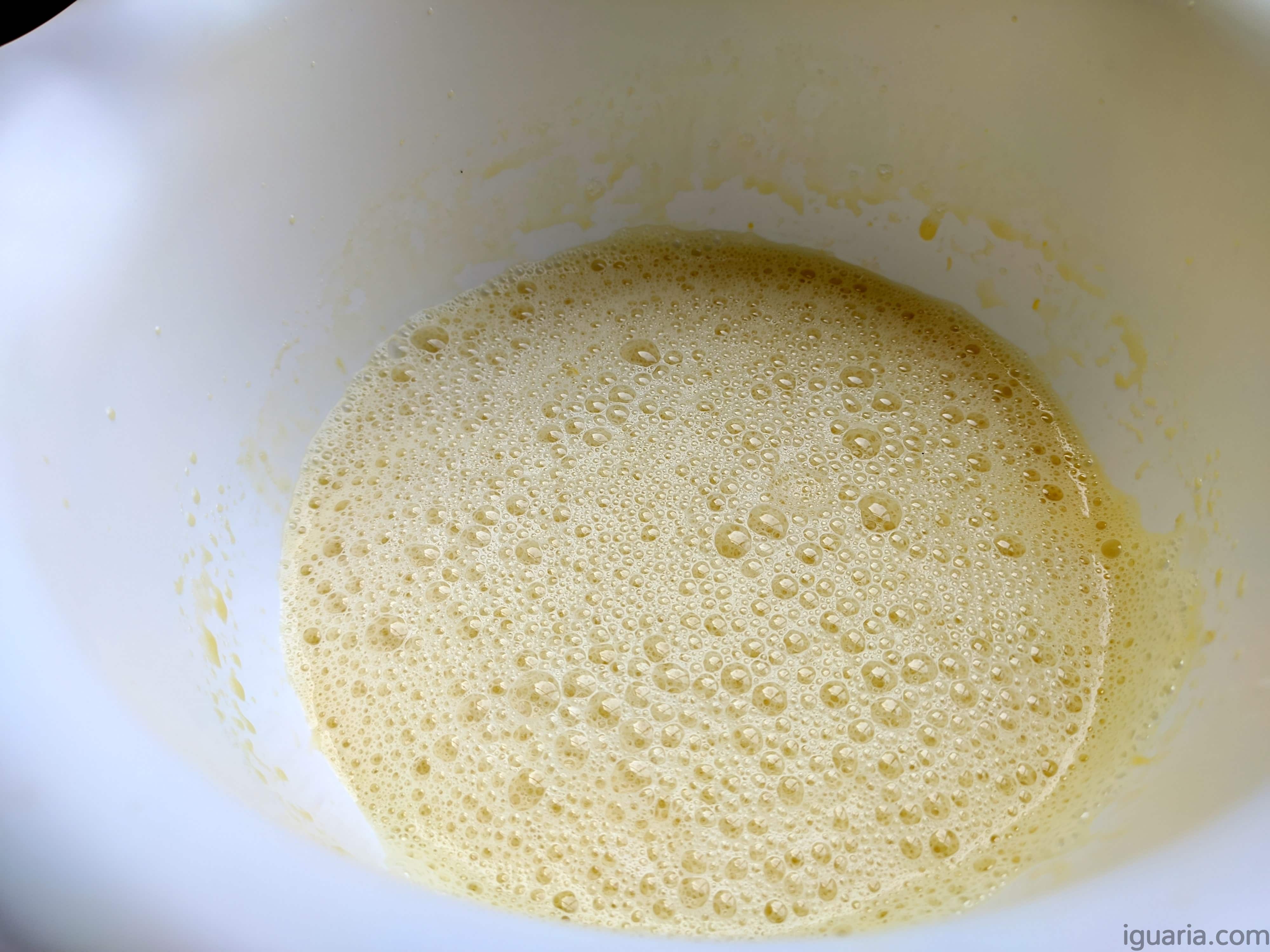 - Numa tigela junta o açúcar e os ovos e bate bem até ficar cremoso, adiciona depois metade do leite e o óleo, seguido de metade da farinha e fermento, mistura bem e depois junta o resto do leite e óleo e farinha e fermento e uma pitada de sal, mistura até ficar bem homogéneo.