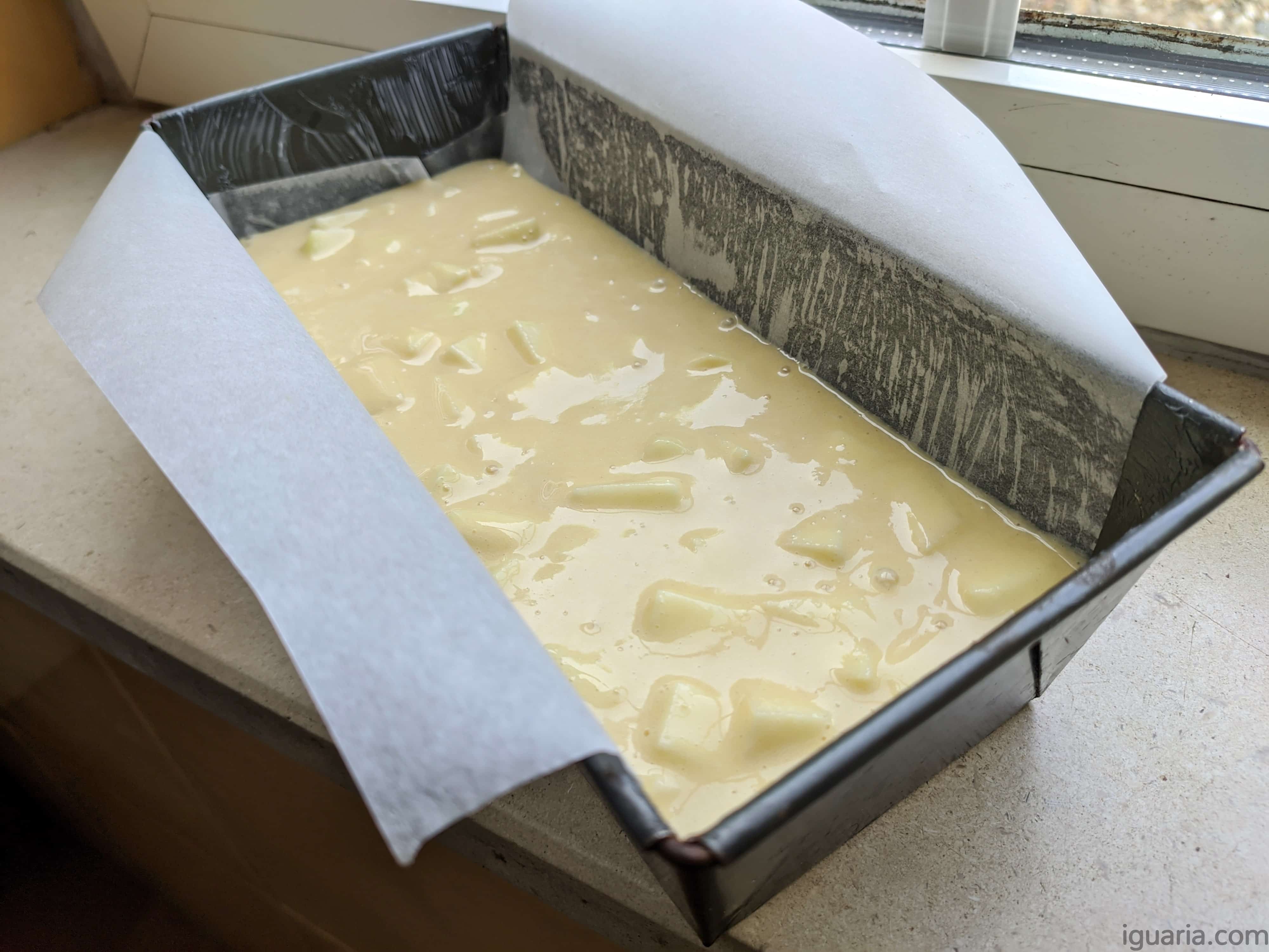 - Pré-aquece o forno a 180ºC e forra uma forma retangular, deita a a massa e leva ao forno a assar por uns 45 minutos até ficar dourado, bom proveito.