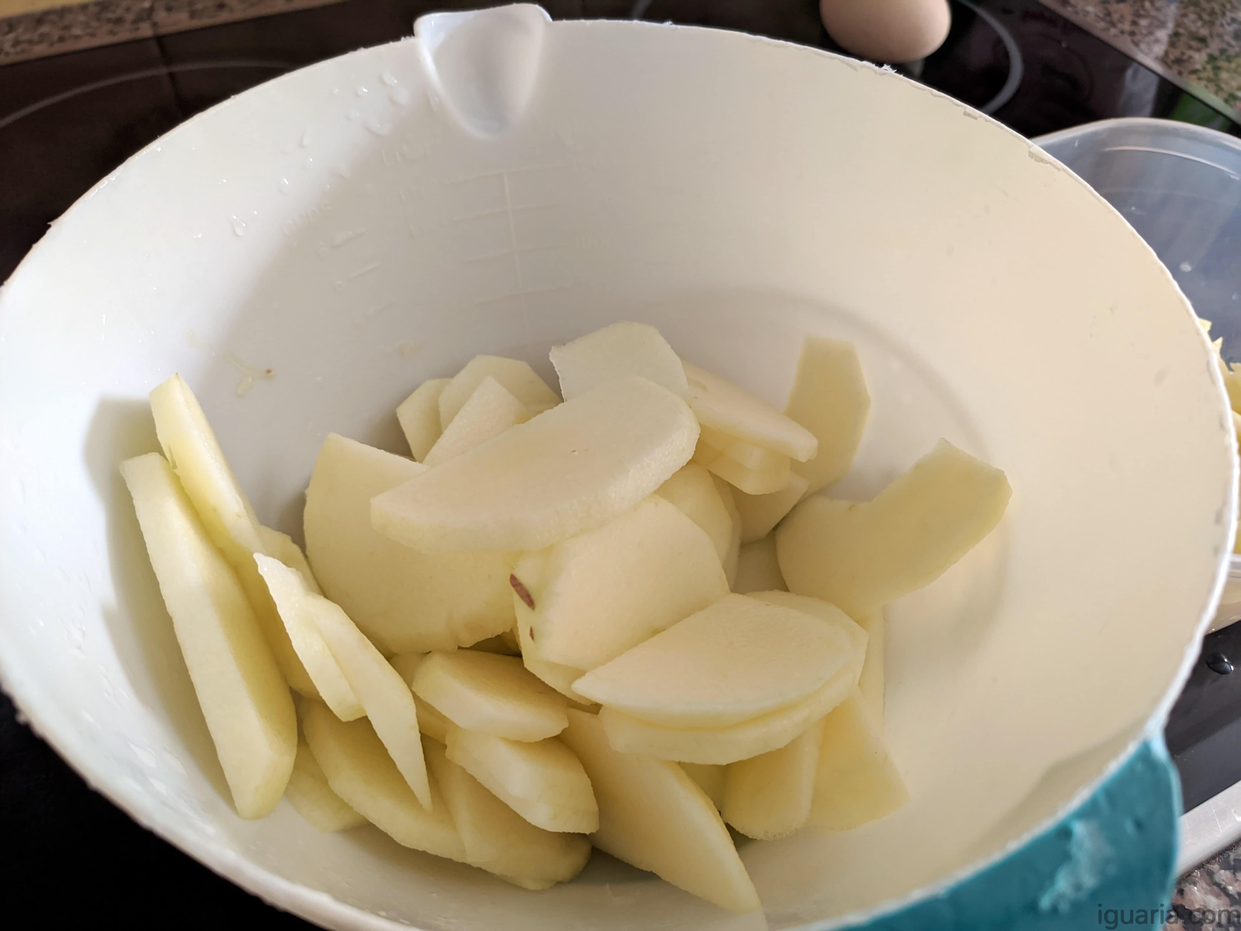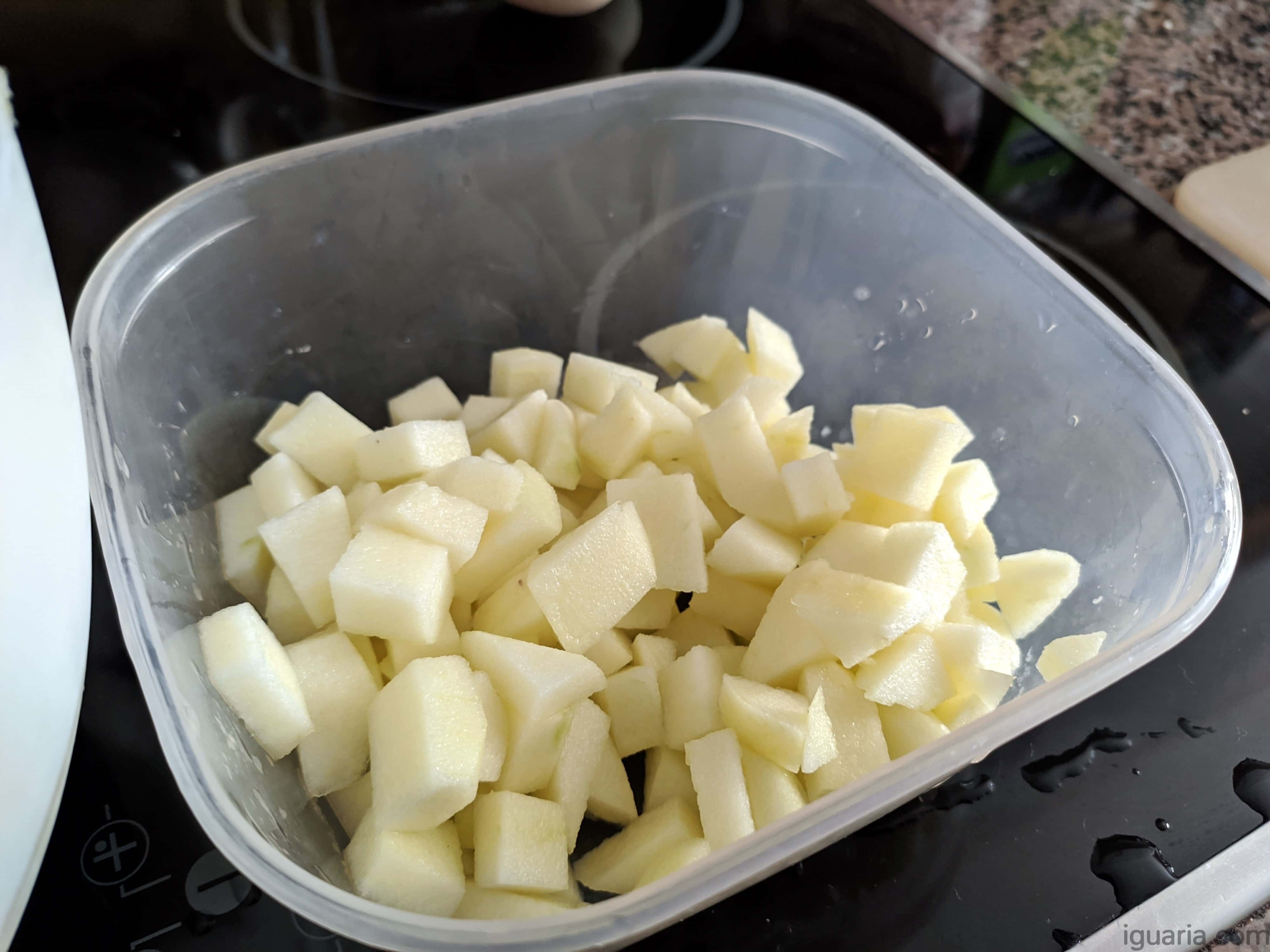 - Descasca as maçãs e pica uma e corta a outra em fatias finas.