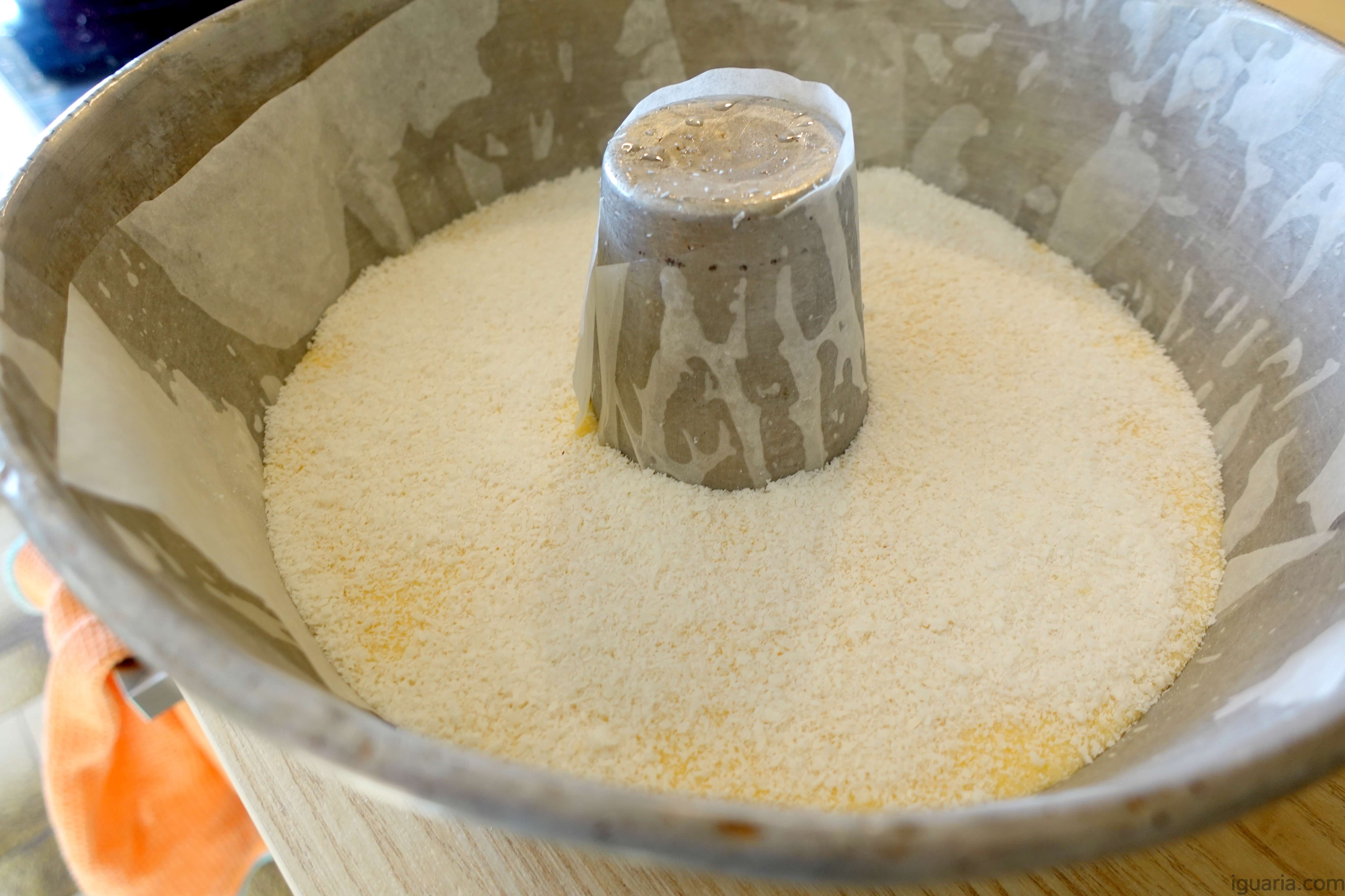 - Deita então esta na forma forrada e polvilha generosamente com o coco ralado.