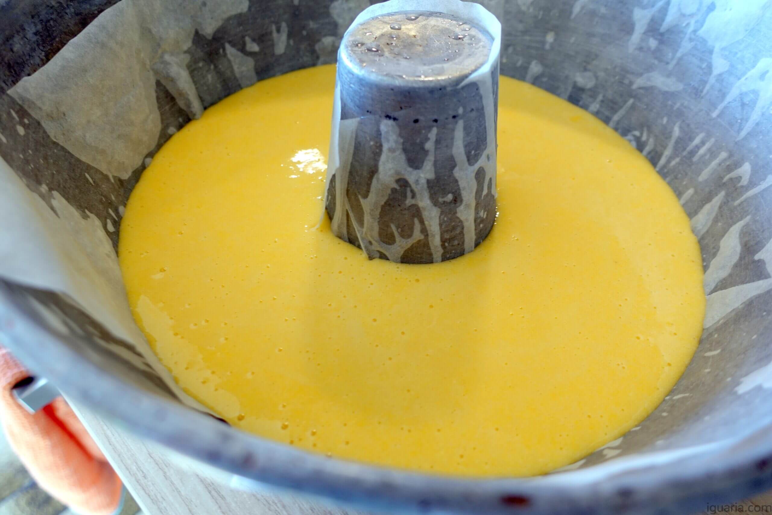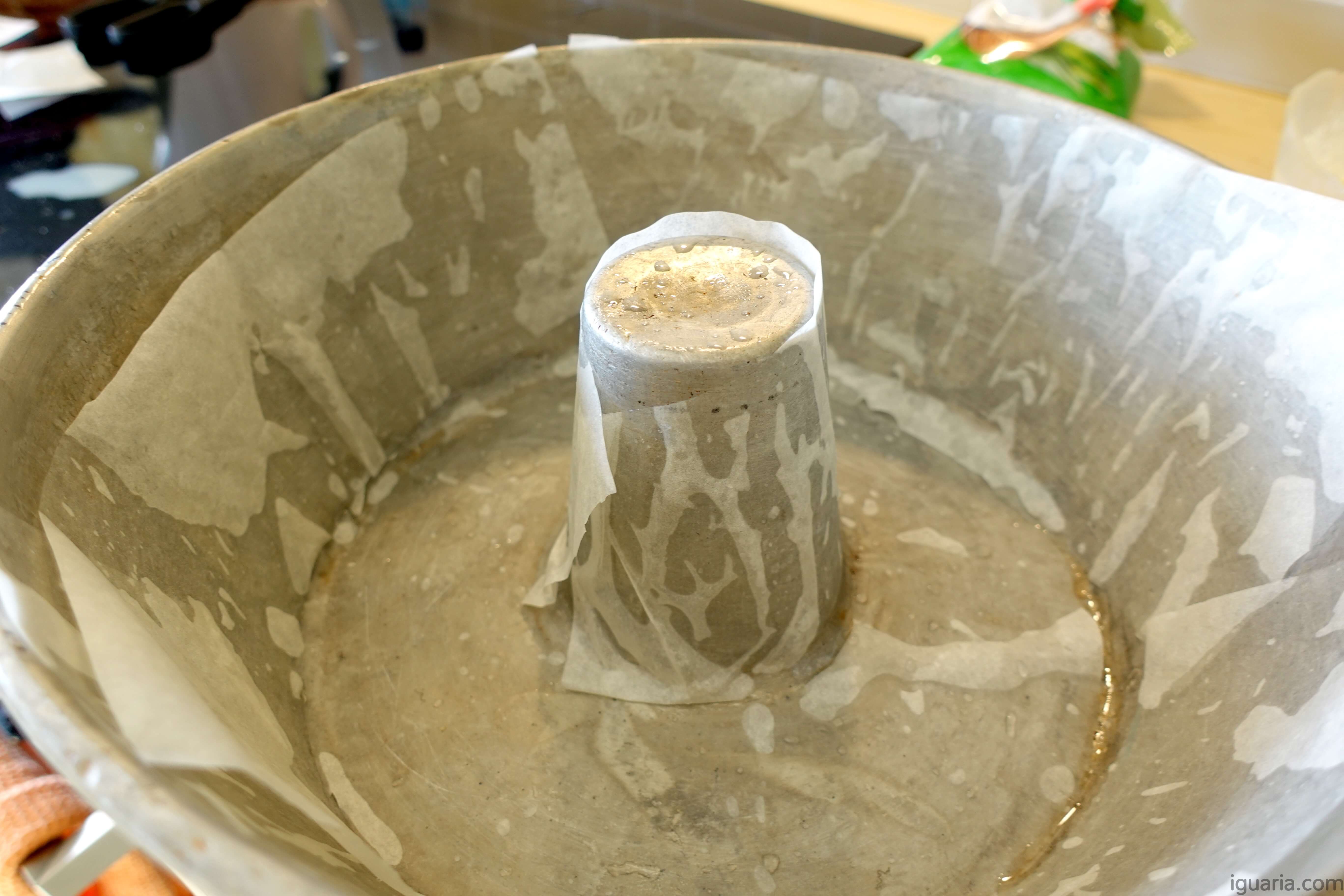 - Pré-aquece o forno a 180ºC e prepara uma forma de castelo untada com óleo e forrada de papel anti-aderente.