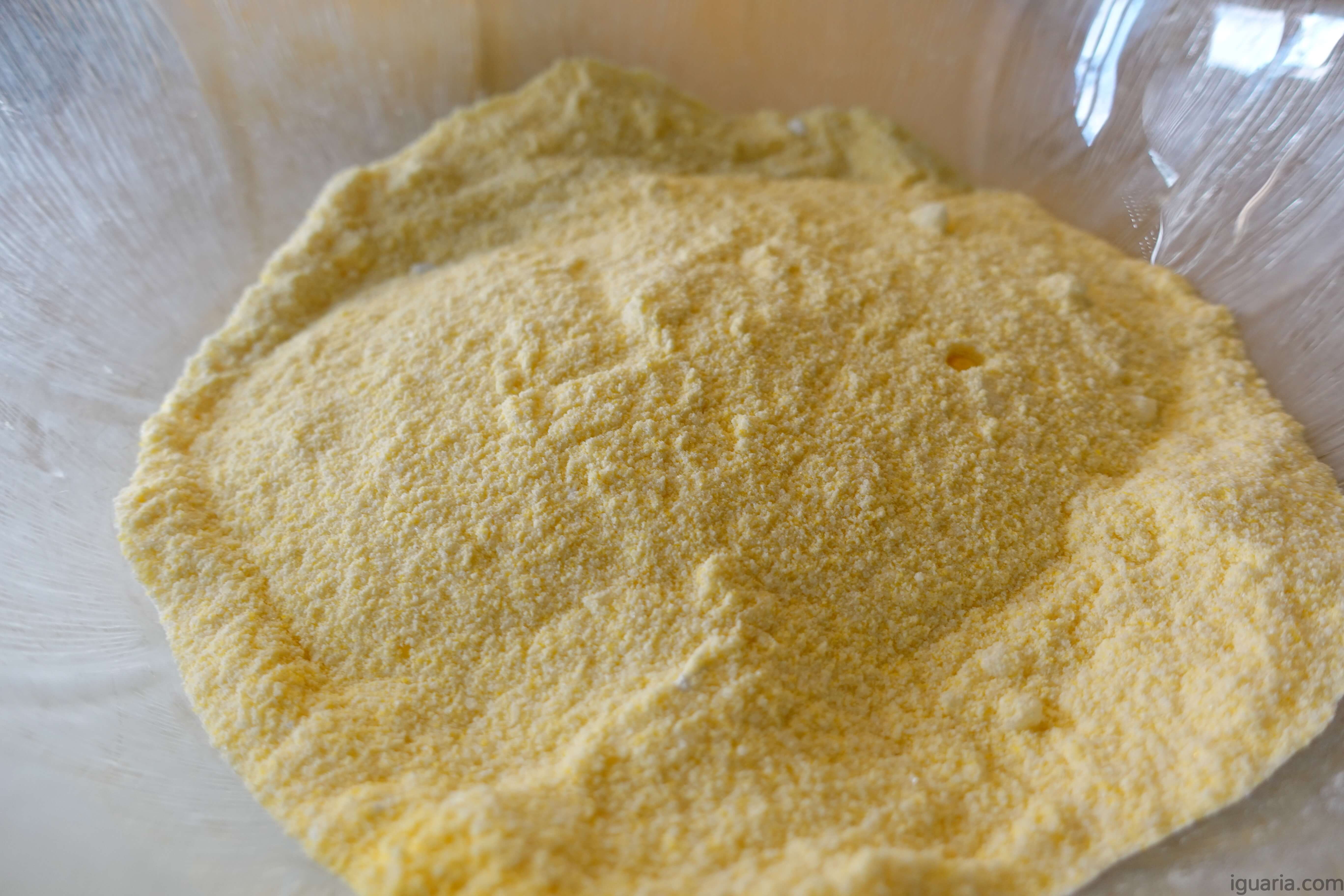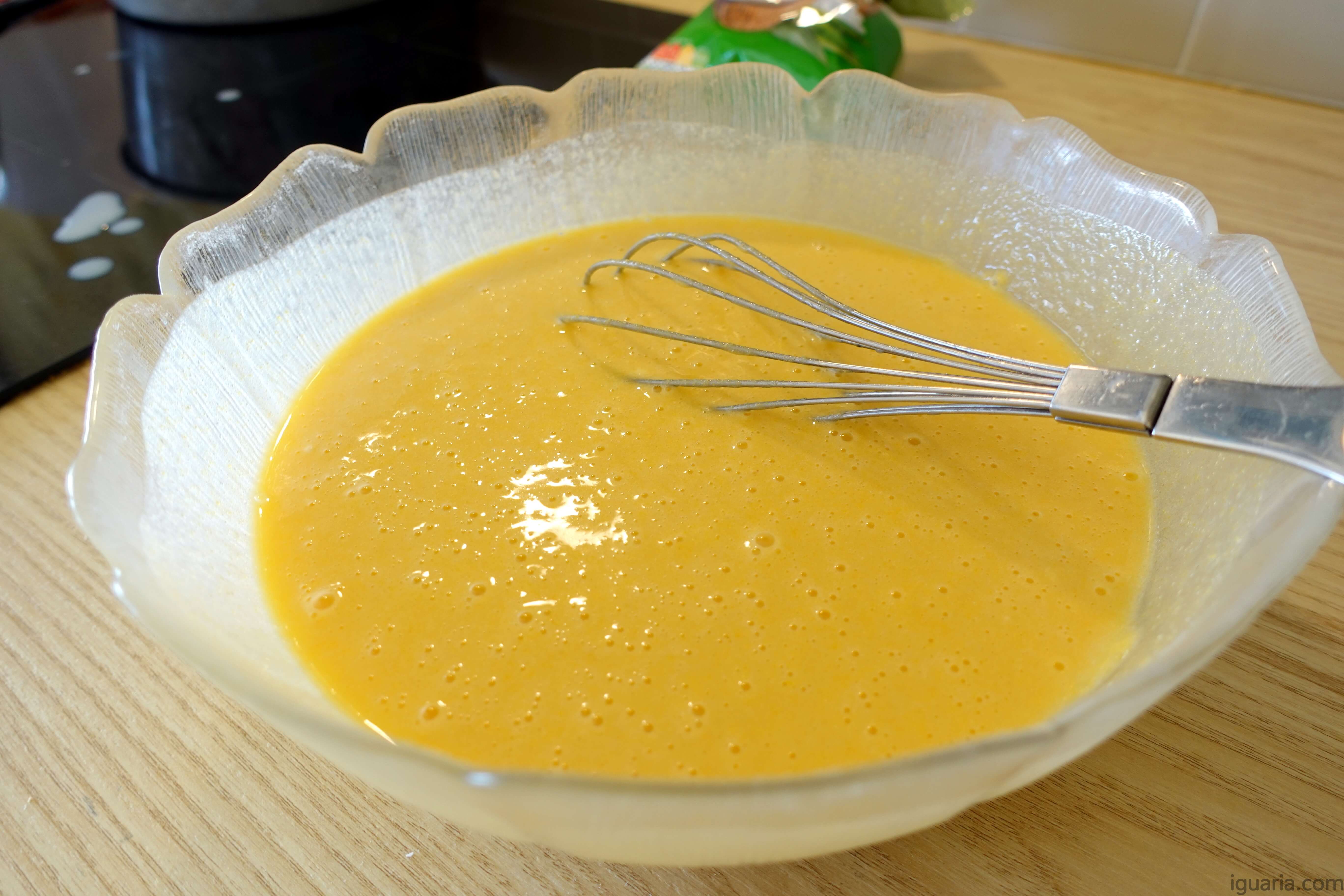 - Adiciona a mistura liquida na tigela com o fubá, mistura e combina até teres uma massa homogénea.