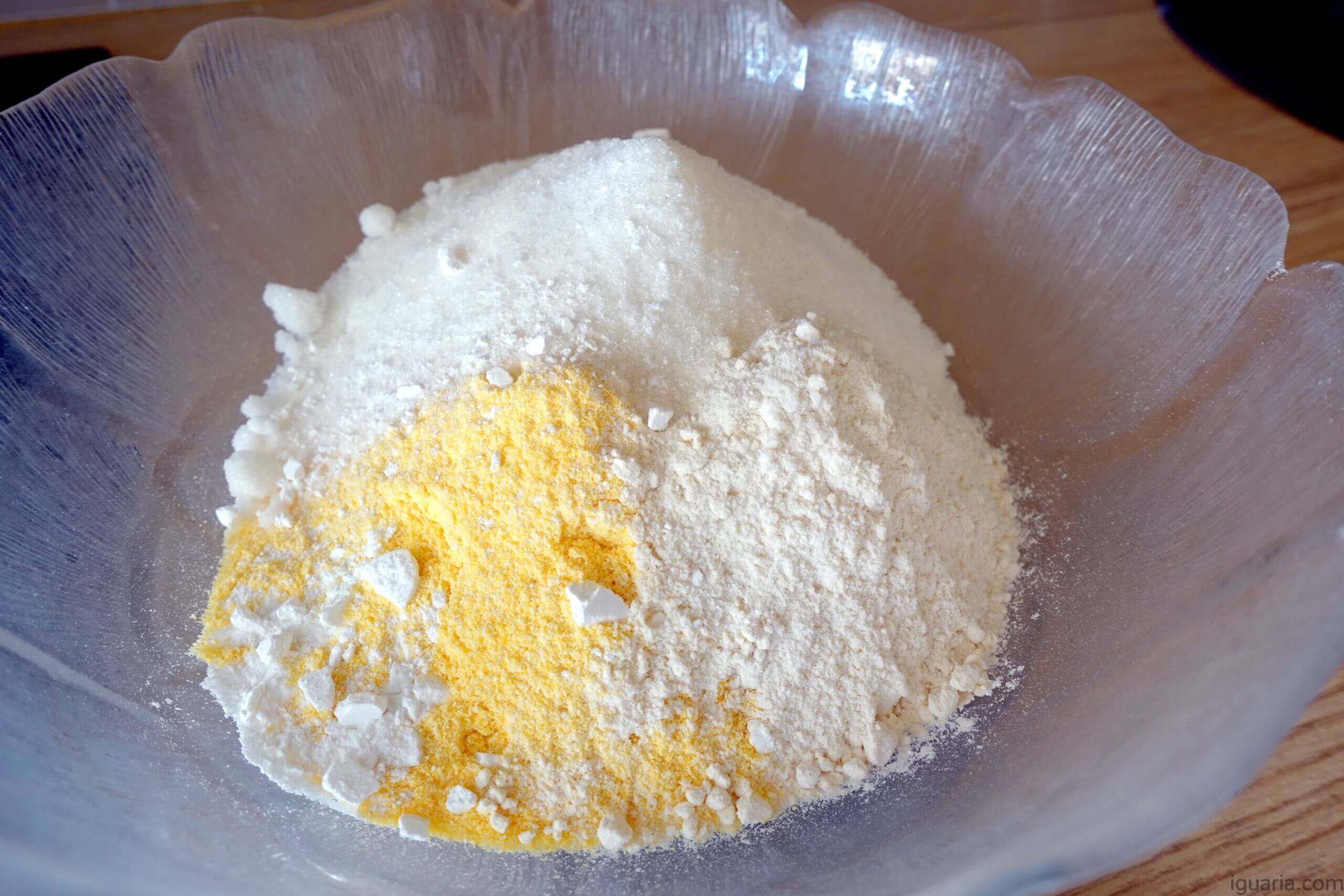 - Começa por junta numa tigela o fubá, farinha, açúcar, fermento e uma pitada de sal, mistura tudo bem.