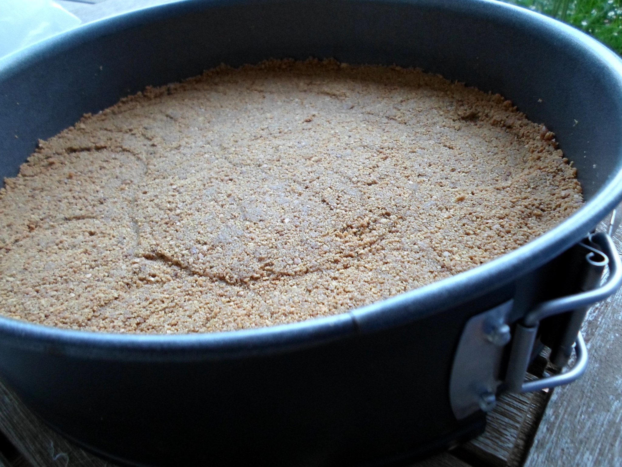 - Numa forma redonda de fundo amovível deita a massa e comprime bem no fundo até criar uma boa base para o cheesecake, leva ao frigorífico para solidificar.