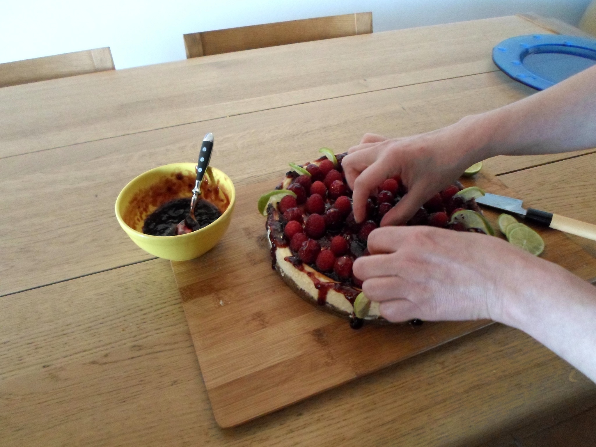 - No dia seguinte cobre tudo com bastante doce de framboesa, depois decora com framboesas e fatias finas de lima.