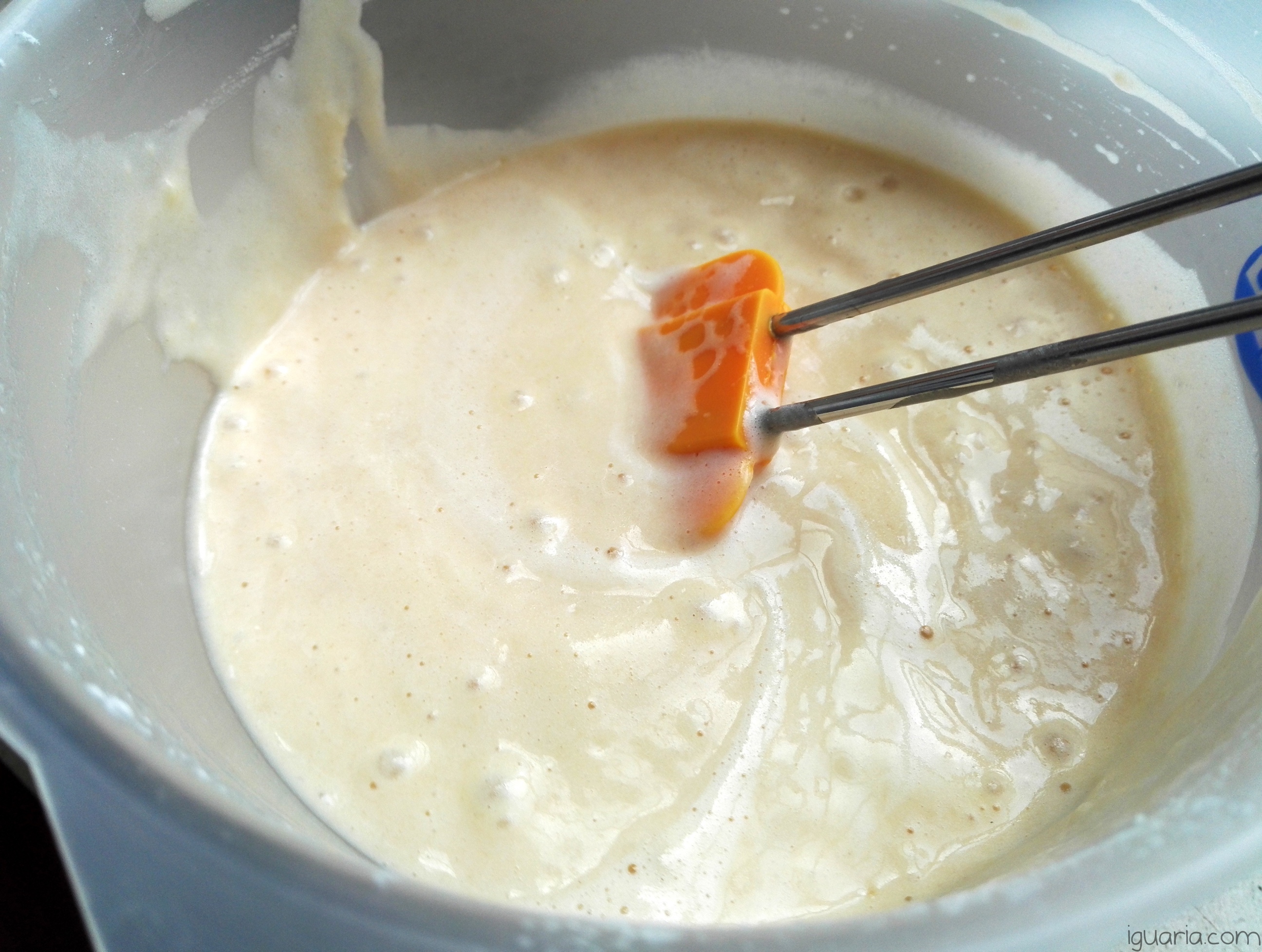 - Repete com outra vez metade da farinha e fermento, mistura e adiciona o resto do leite e mistura.