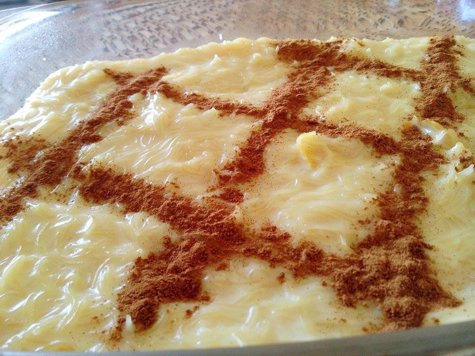 Esta aletria é feita com pudim mandarim em vez dos ovos para engrossar a mistura.