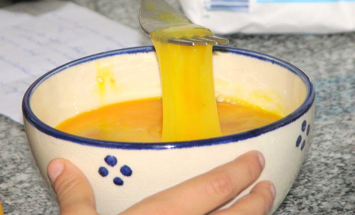 - Agora numa panela a parte põe as gemas batidas em lume brando, e vai-se deitando aos poucos o açúcar morno nas gemas, mexendo sempre com uma colher de pau até atingir a espessura necessária (levanta a colher com o preparado e este deve ser bastante espesso e escorrer com dificuldade), se passares a colher pelo fundo e vires o fundo, então não cozinhes mais esse é o ponto máximo que deves cozinhar as gemas.