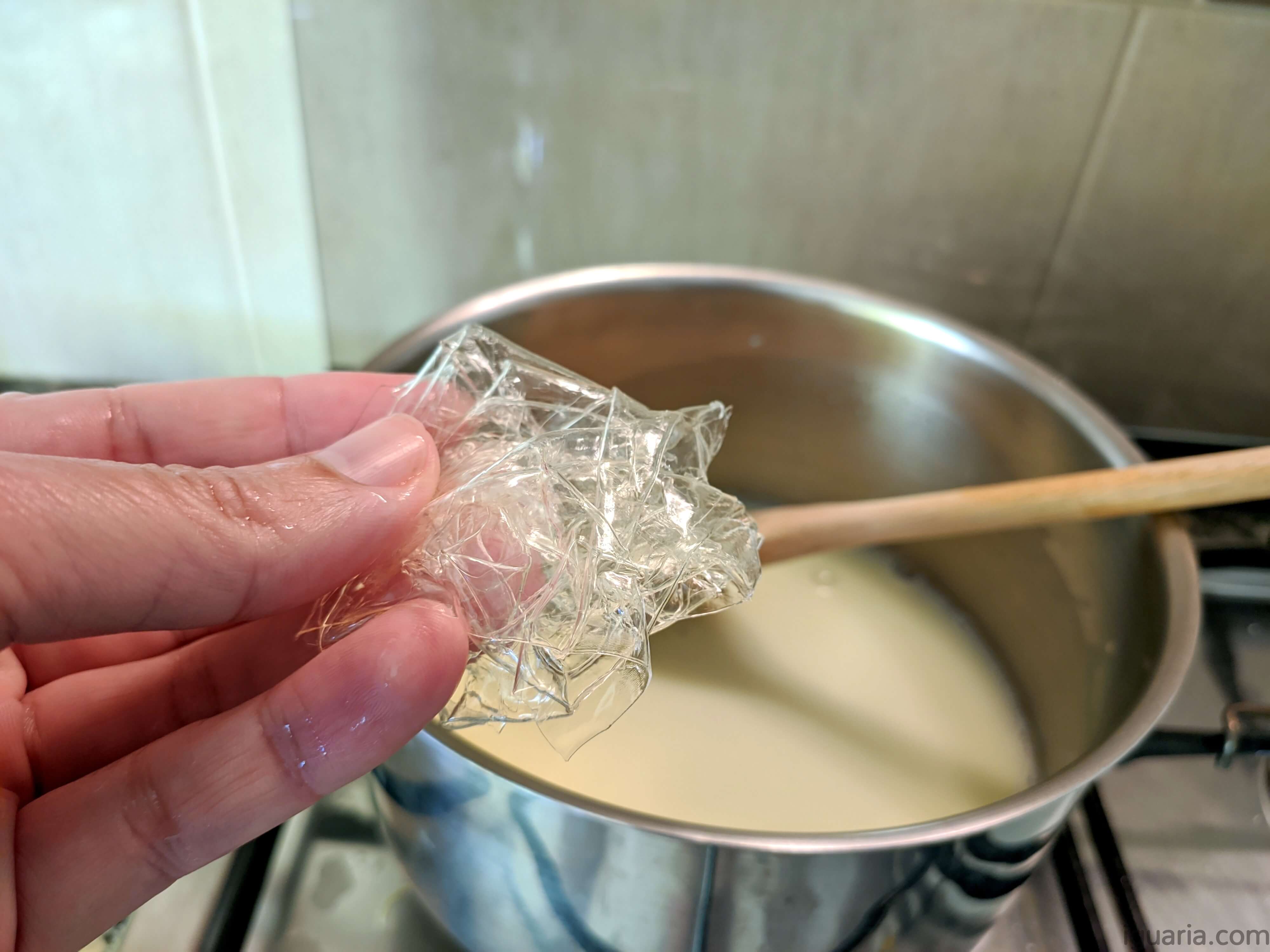 - Começa por hidratar a folha de gelatina numa tacinha com um pouco de água a temperatura ambiente.