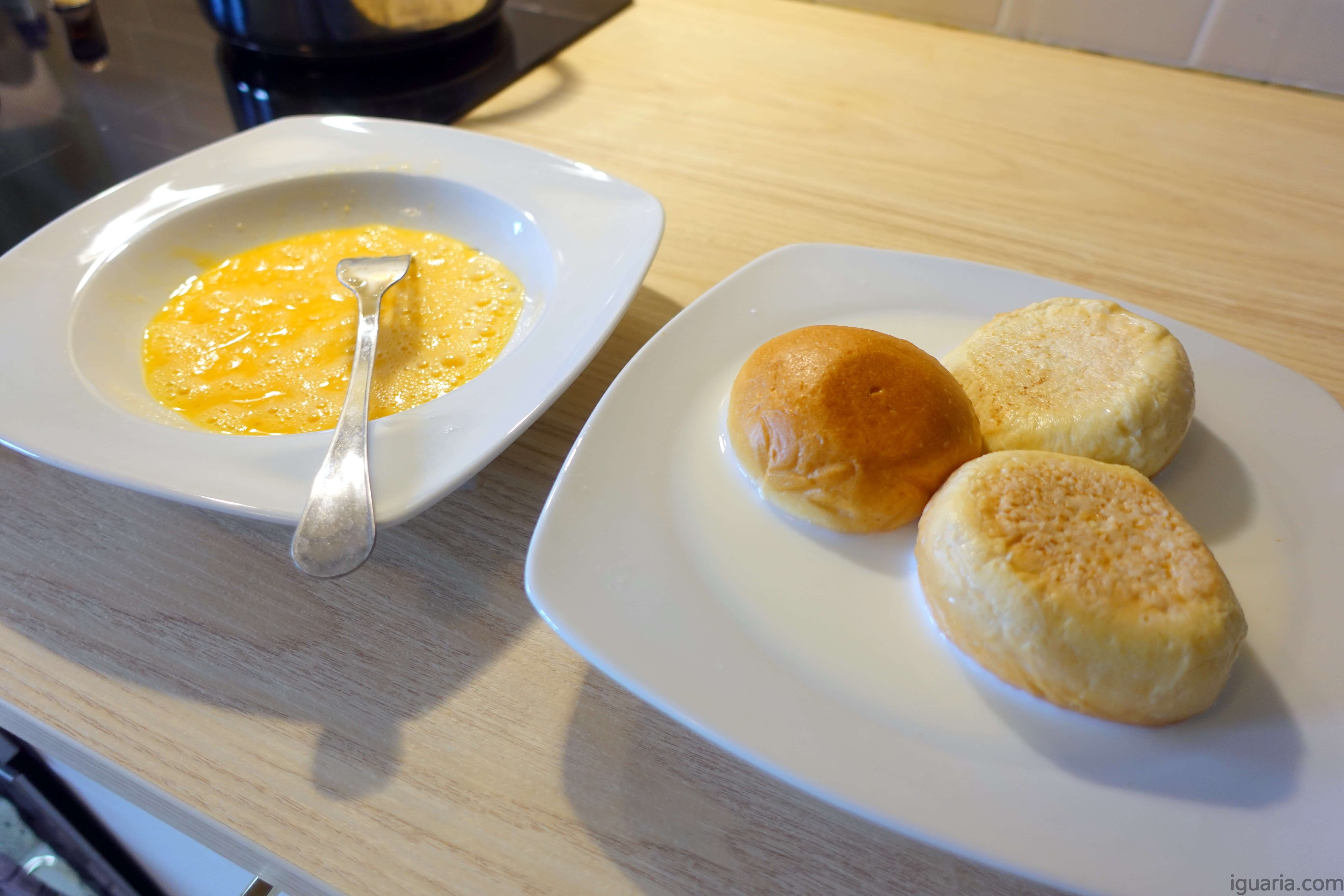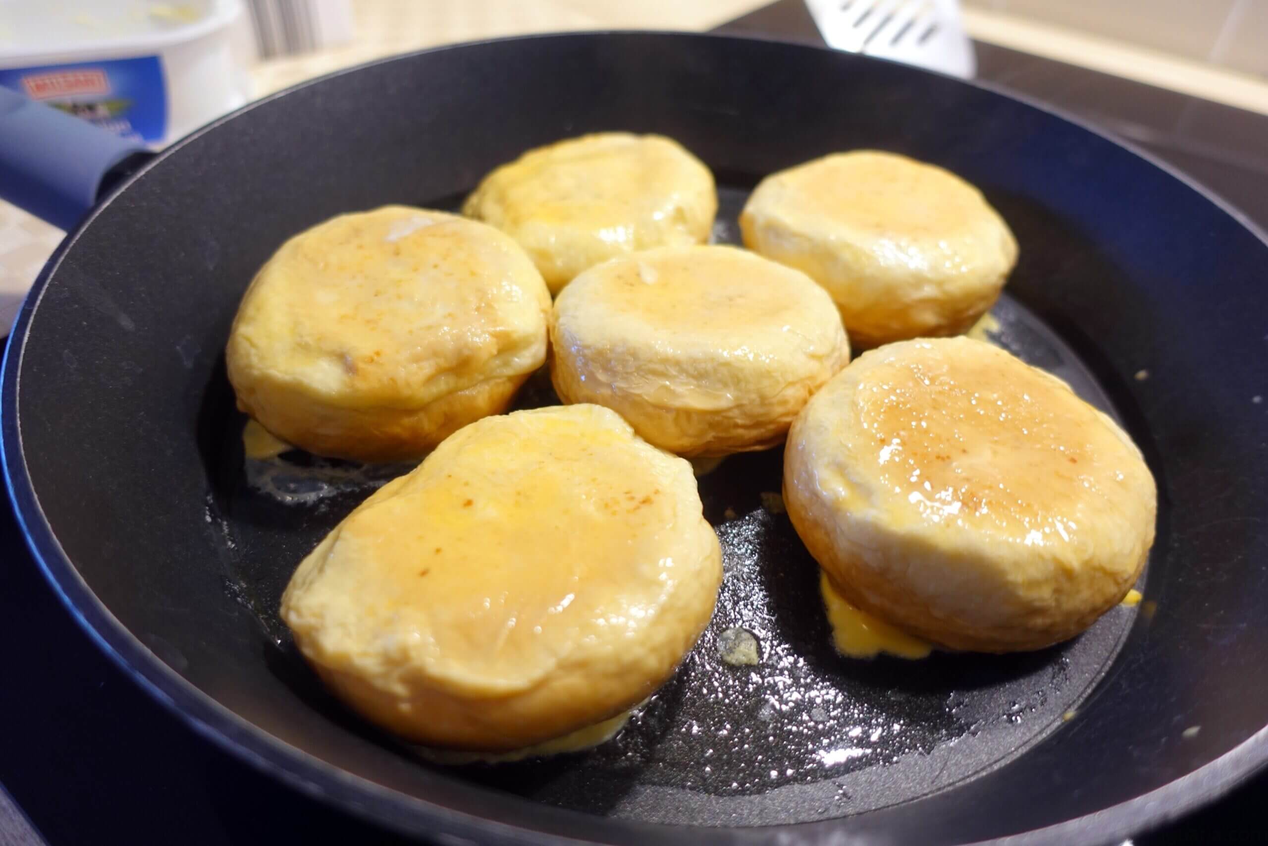 - Depois passa cada um deles rapidamente bem pelo ovo batido e depois leva a frigideira, repete para todos os pãezinhos.