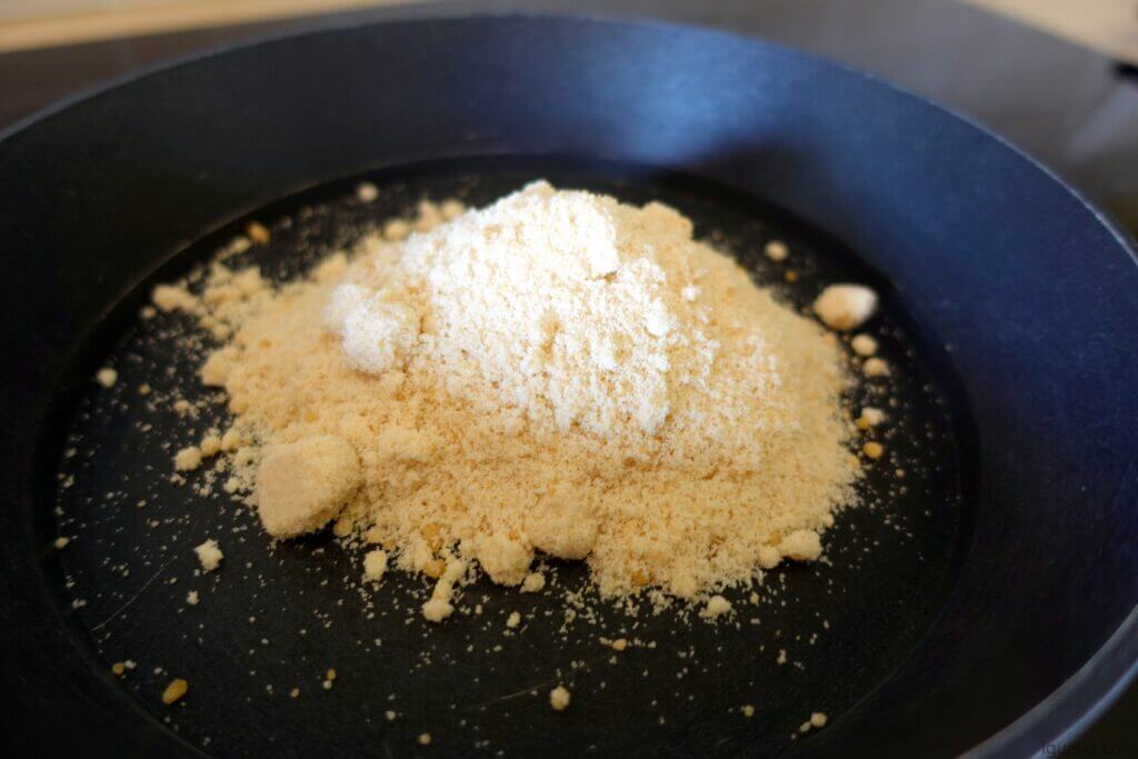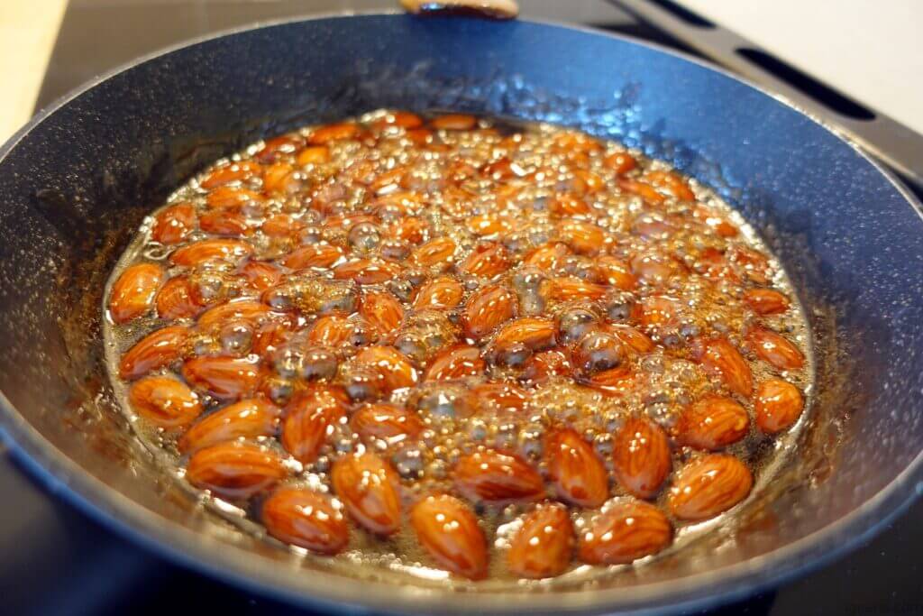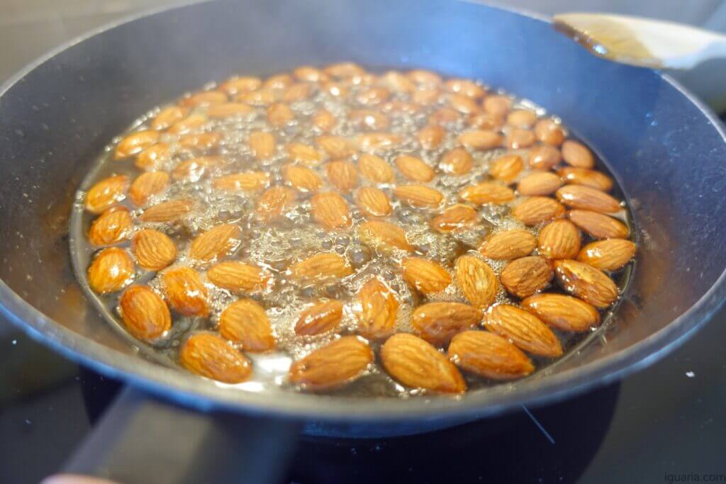 4. Quando o caramelo começar a mudar de cor adiciona as amêndoas e mistura por uns segundos.