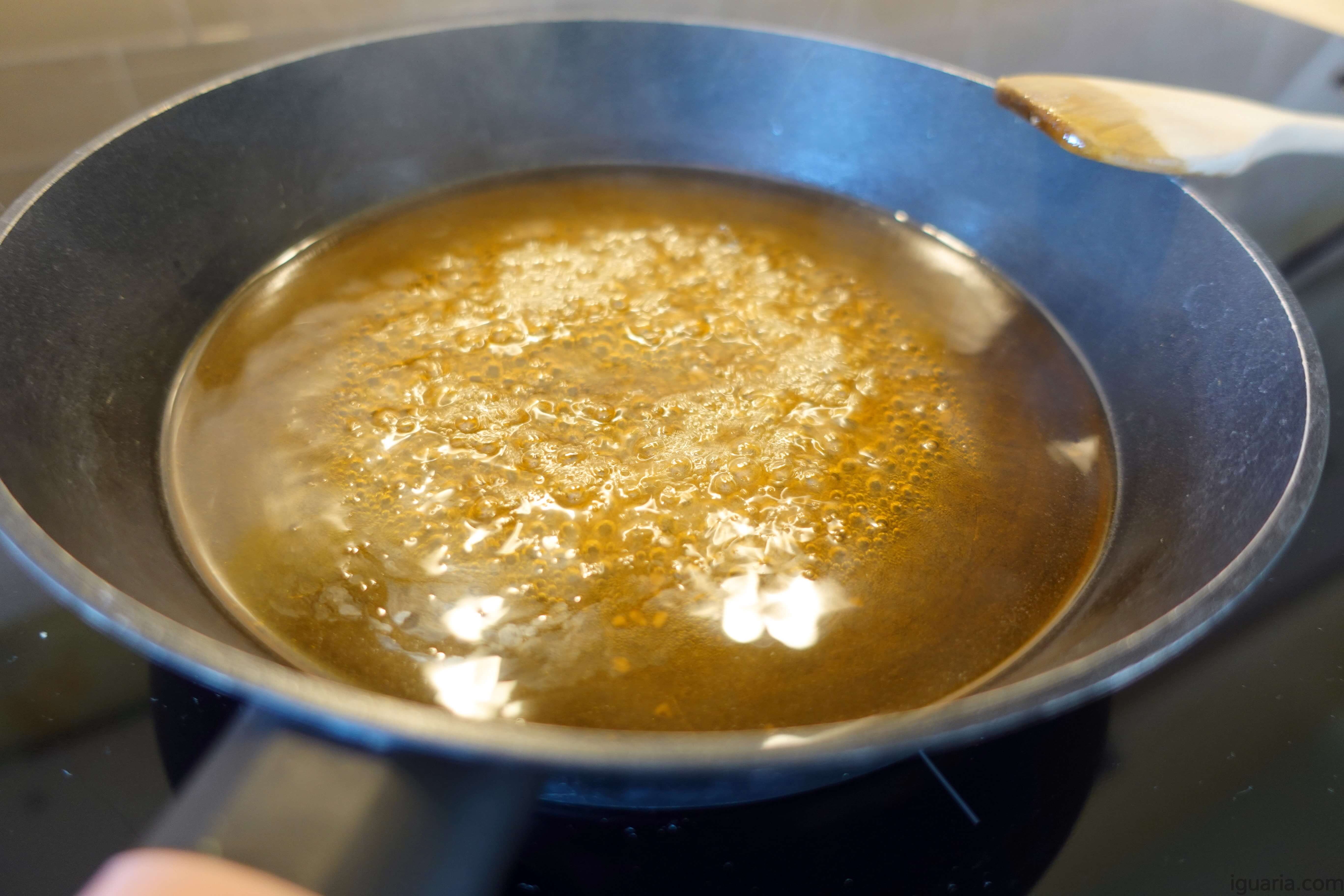 3. Numa frigideira pequena, junta a água e o açúcar amarelo e leva a um lume médio alto.