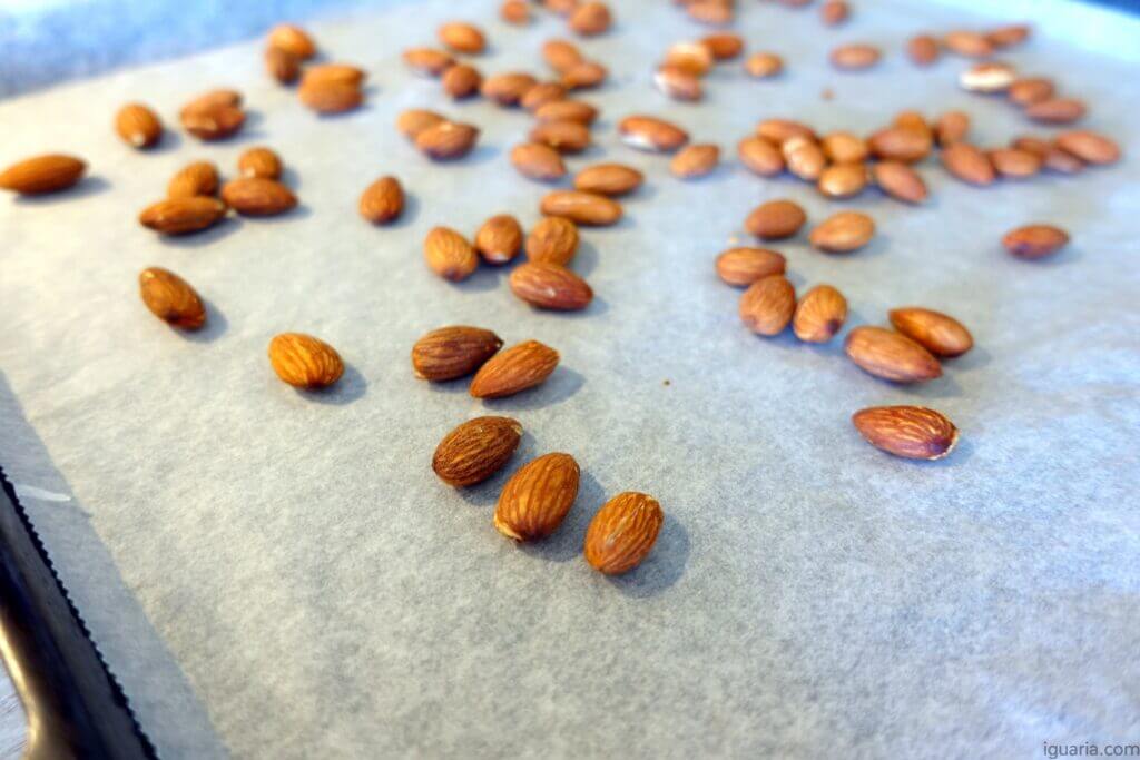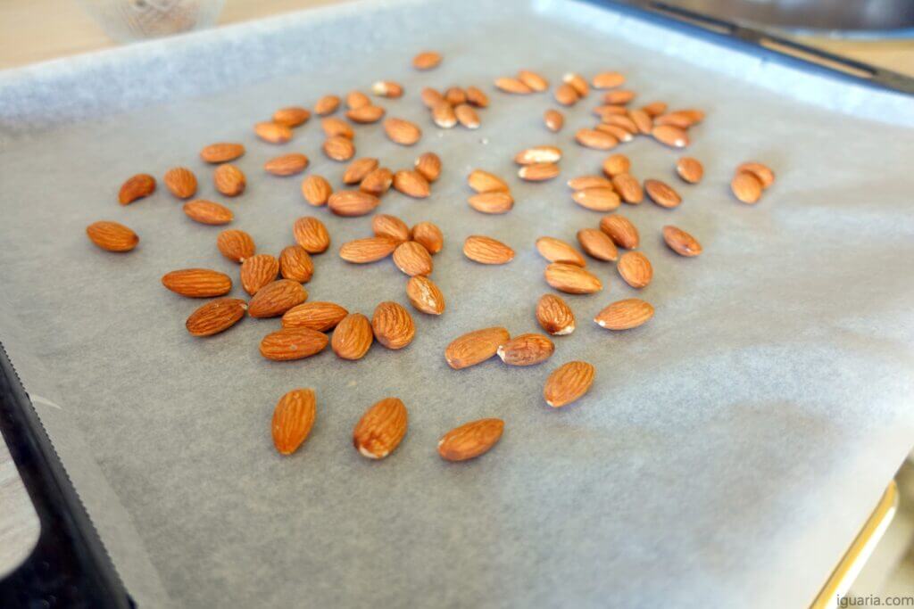 1. Começa por torrar as amêndoas com pele no forno a 180ºC até ficarem bem louras e torradas.