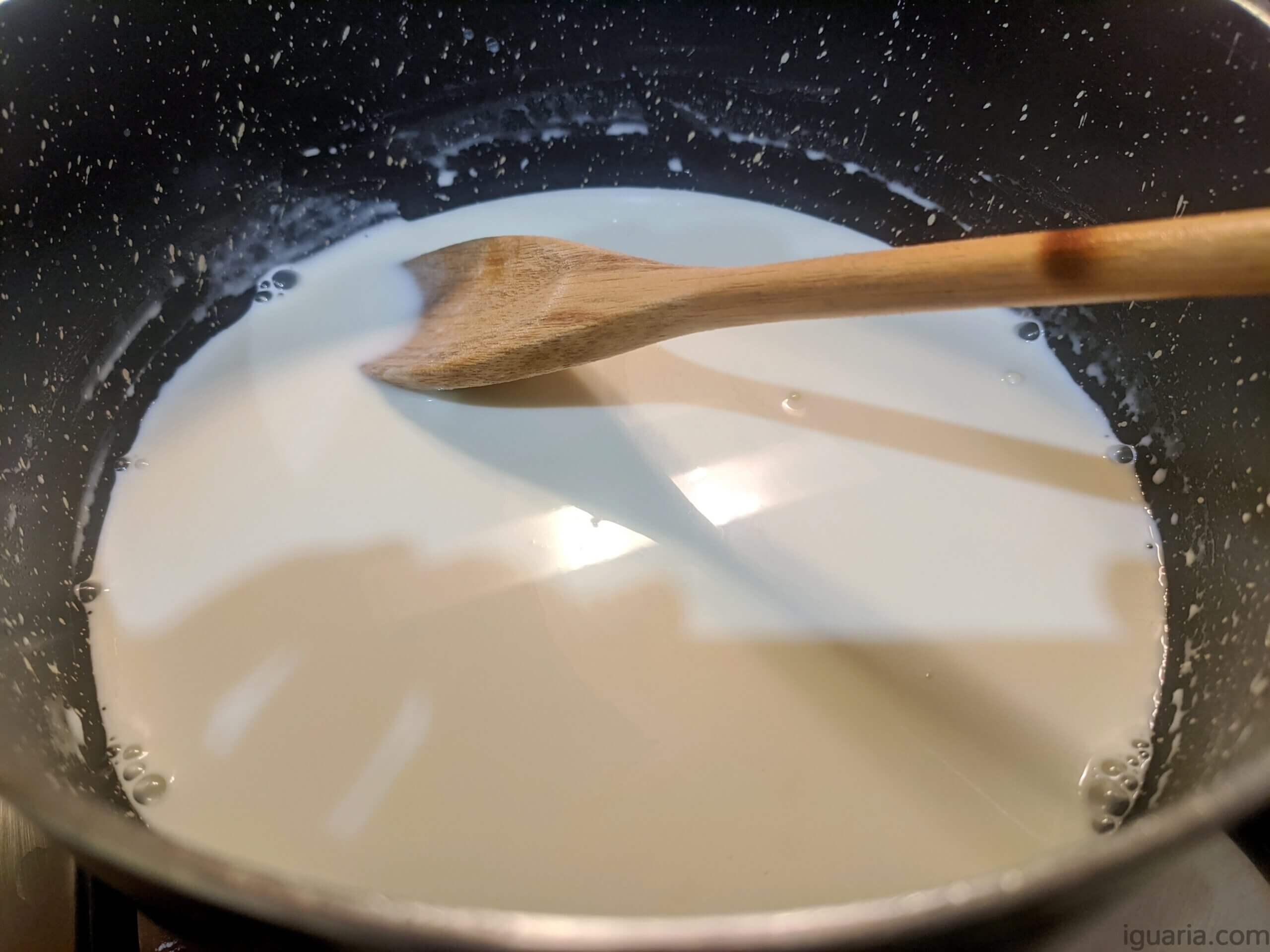 - Num tacho junta o leite, as natas, o açúcar e a baunilha, mistura e leva a um lume médio-baixo, não deixes ferver, só queres aquecer bem a mistura.