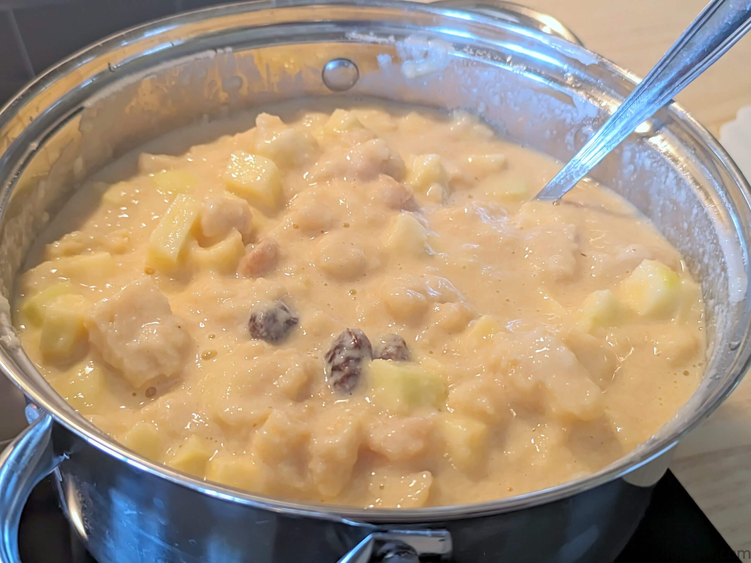 - Descasca o pão e corta este em cubos pequenos e junta ao leite com ovos, seguido das passas, mistura, descasca então as maçãs e corta estas em cubos ou fatias finas e junta também á mistura de leite e ovos.