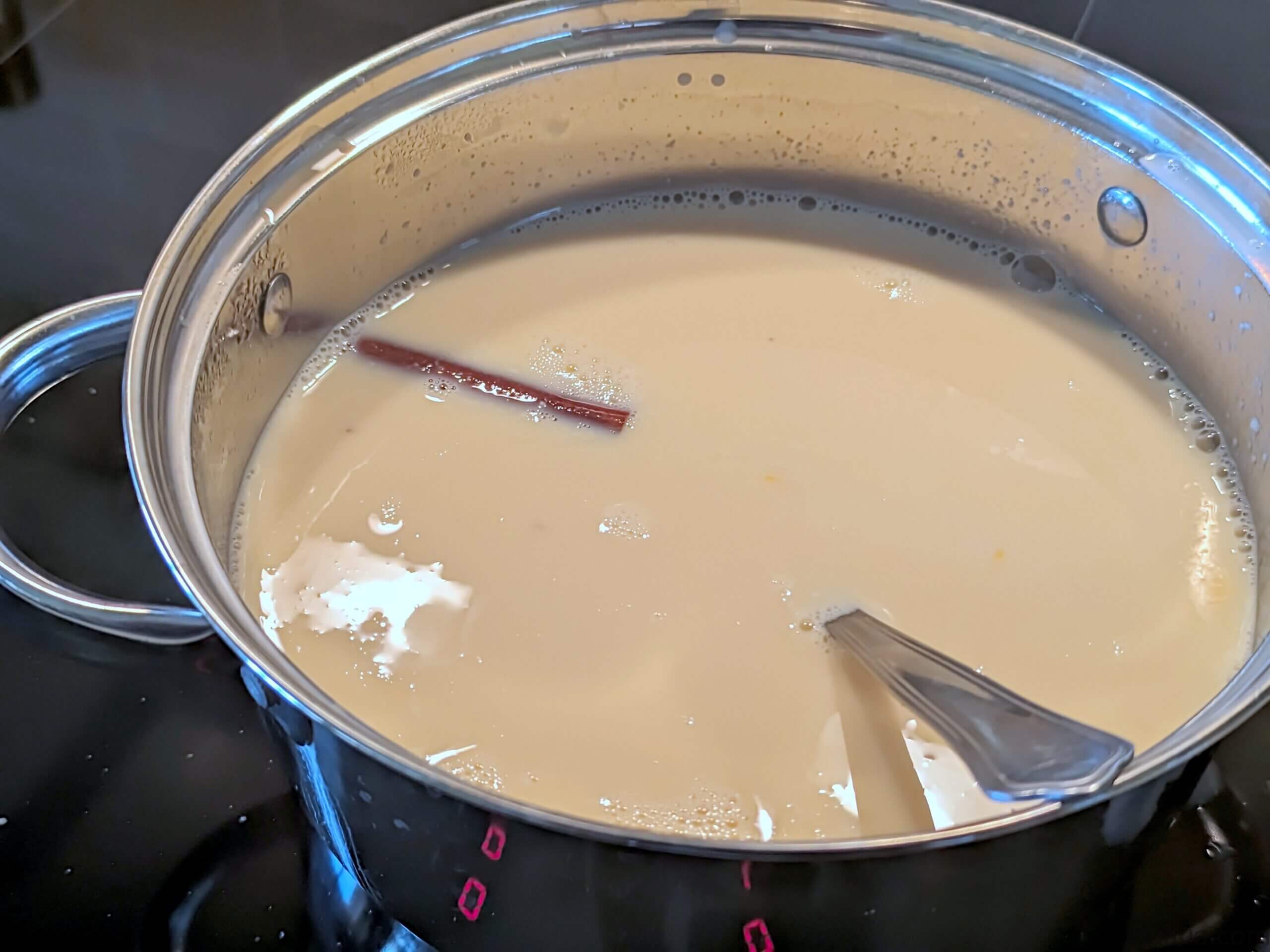 - Quando os ovos estiverem quentes, deita a mistura de ovos no leite quente, sempre a mexer, deixa cozinhar mais um par de minutos e depois retira do lume.