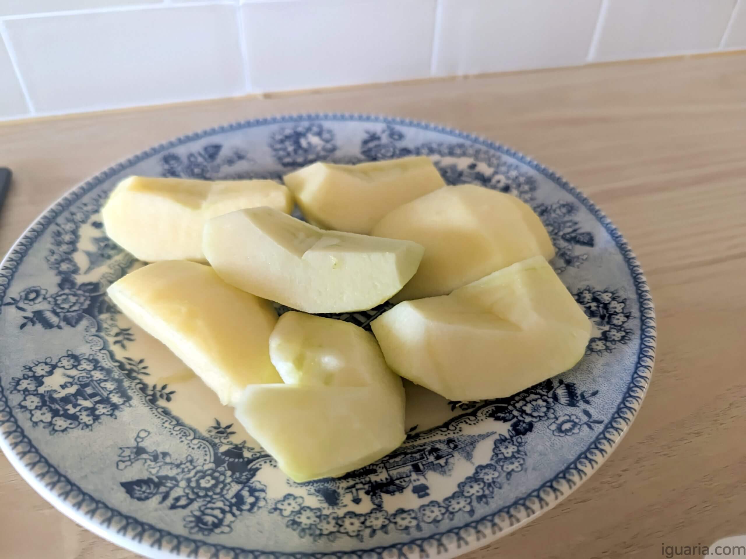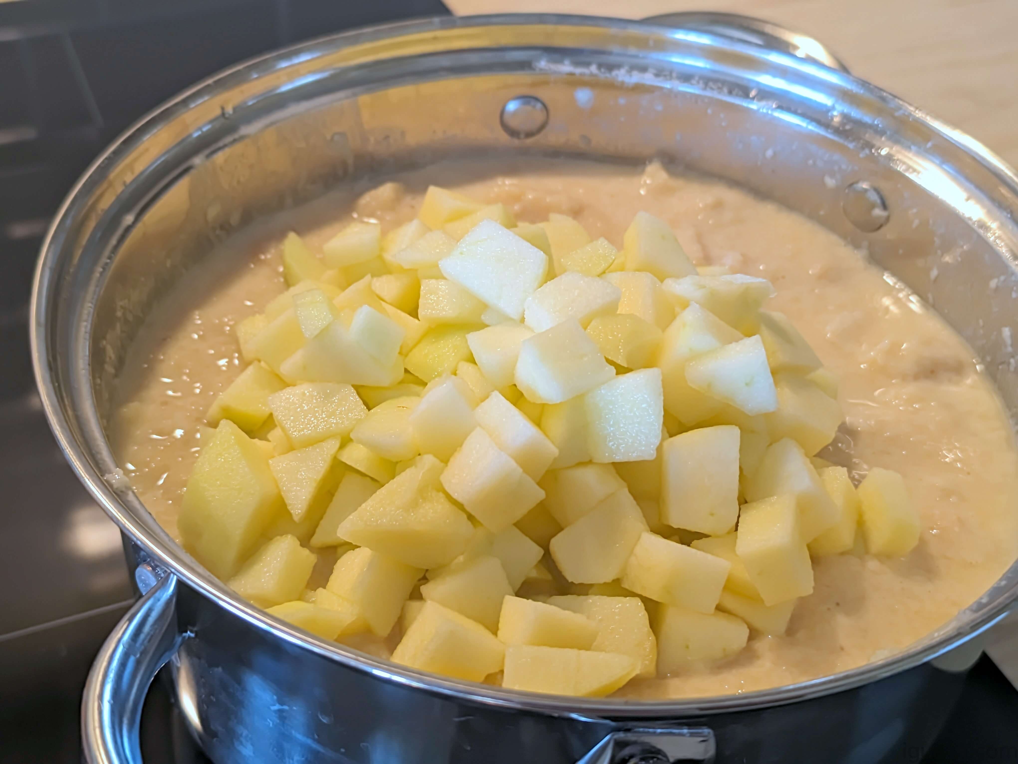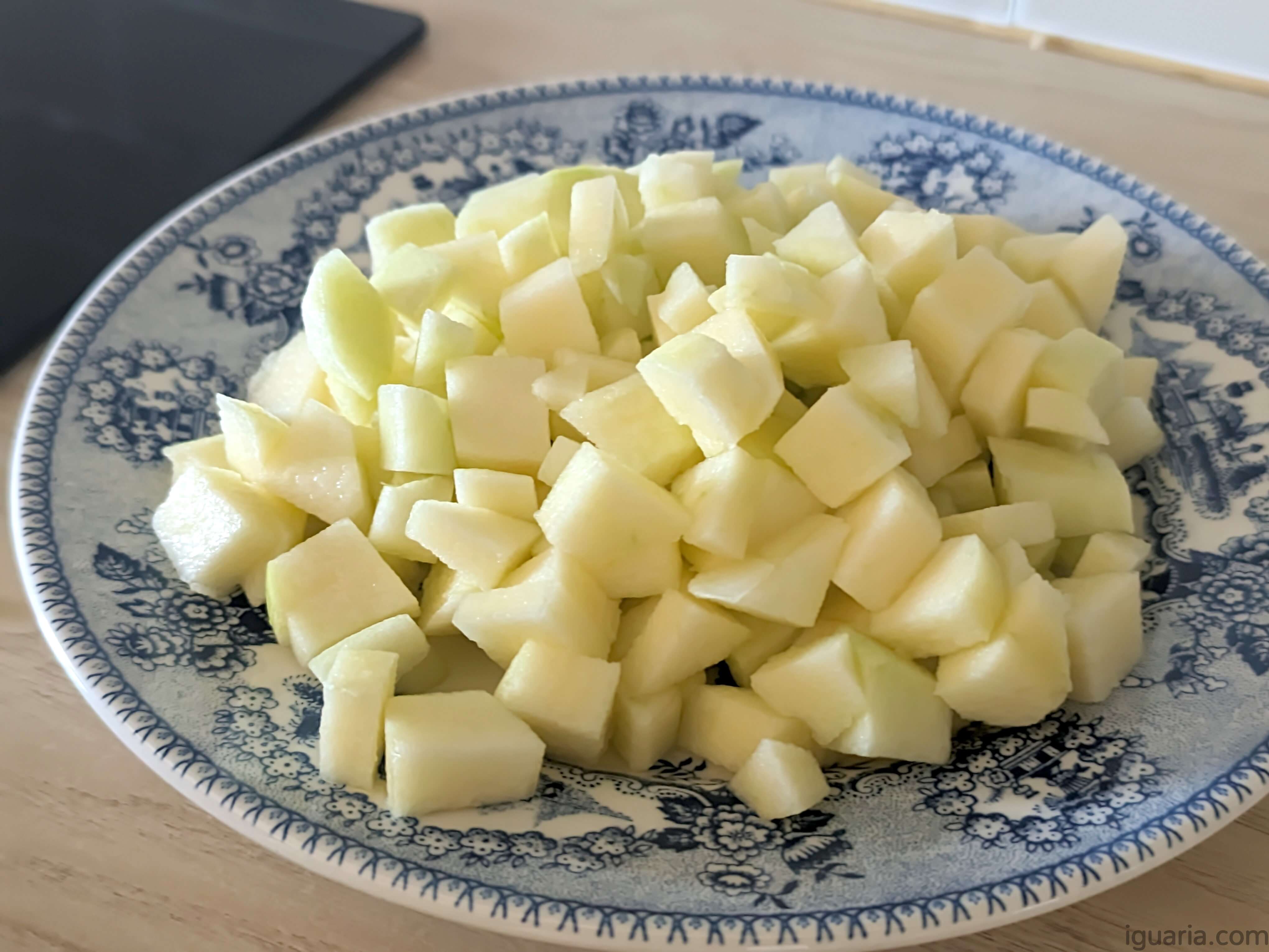 - Descasca o pão e corta este em cubos pequenos e junta ao leite com ovos, seguido das passas, mistura, descasca então as maçãs e corta estas em cubos ou fatias finas e junta também á mistura de leite e ovos.