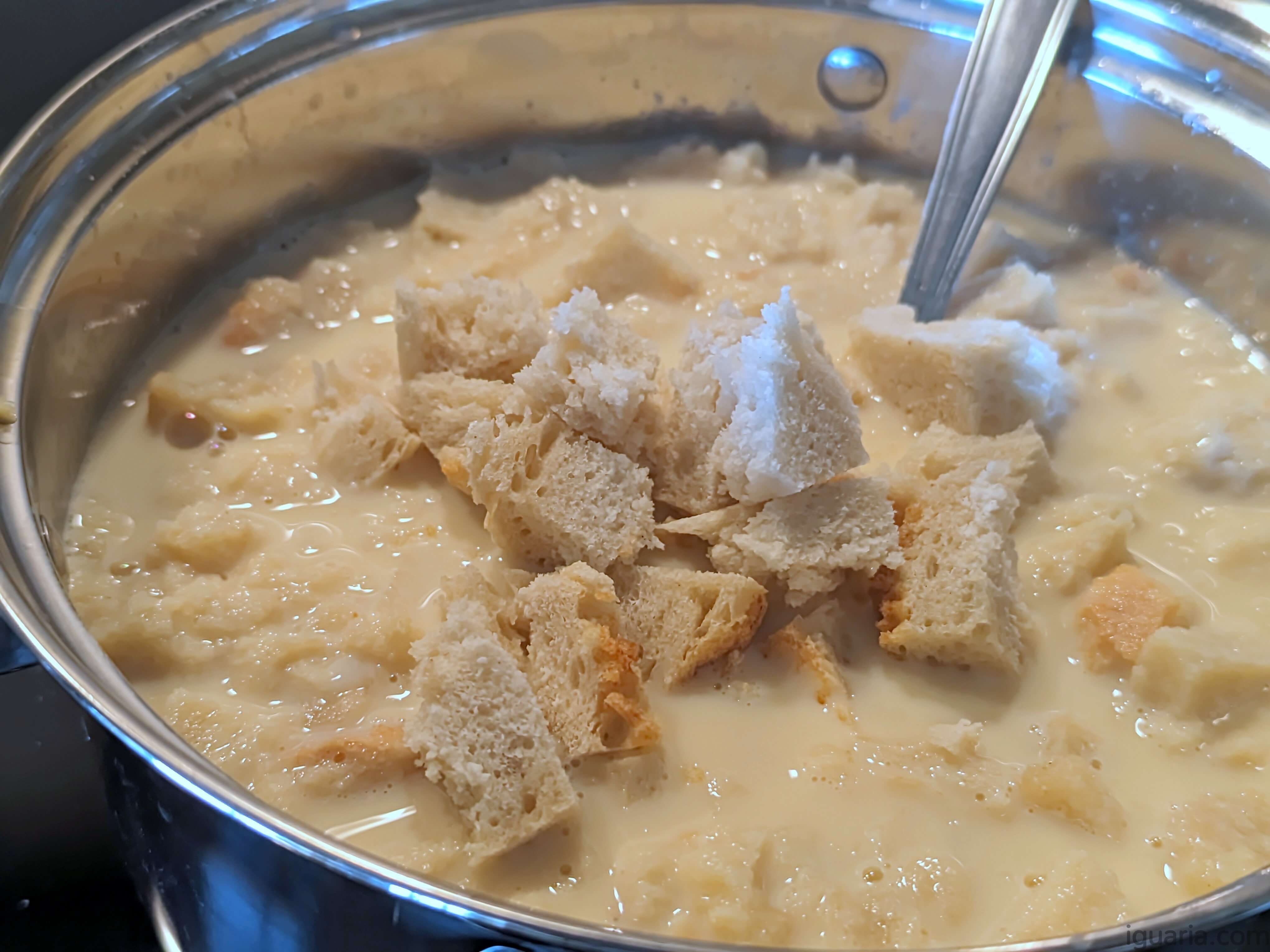 O segredo está em deixar o pão de molho no leite morno durante pelo menos 1 hora, assim garantes que absorve uniformemente e não ficas com pedaços duros no meio do pudim.