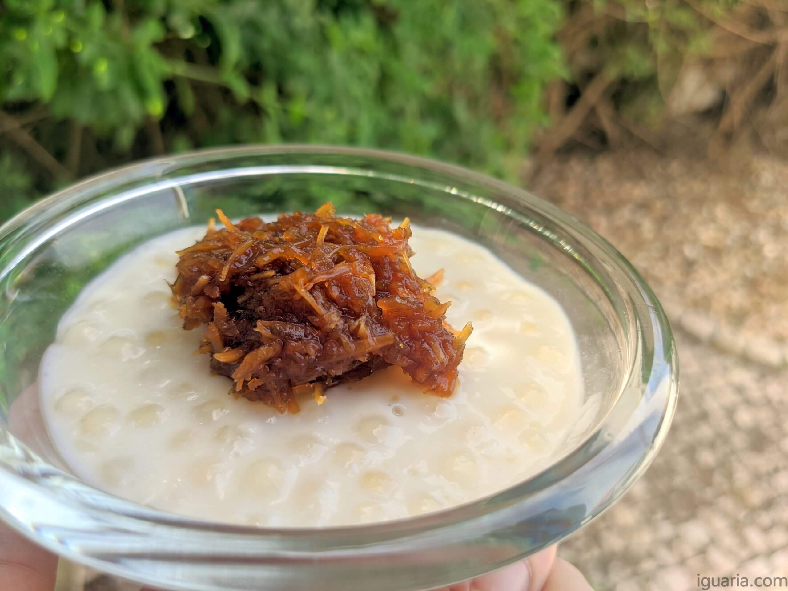 Nada como um belo pudim de tapioca com coco, tens aquela cremosidade com aroma a coco e depois aquelas bolinhas esponjosas deliciosas da tapioca para dar aquela textura especial, a cocada é só para ser mais decadente hehehe.