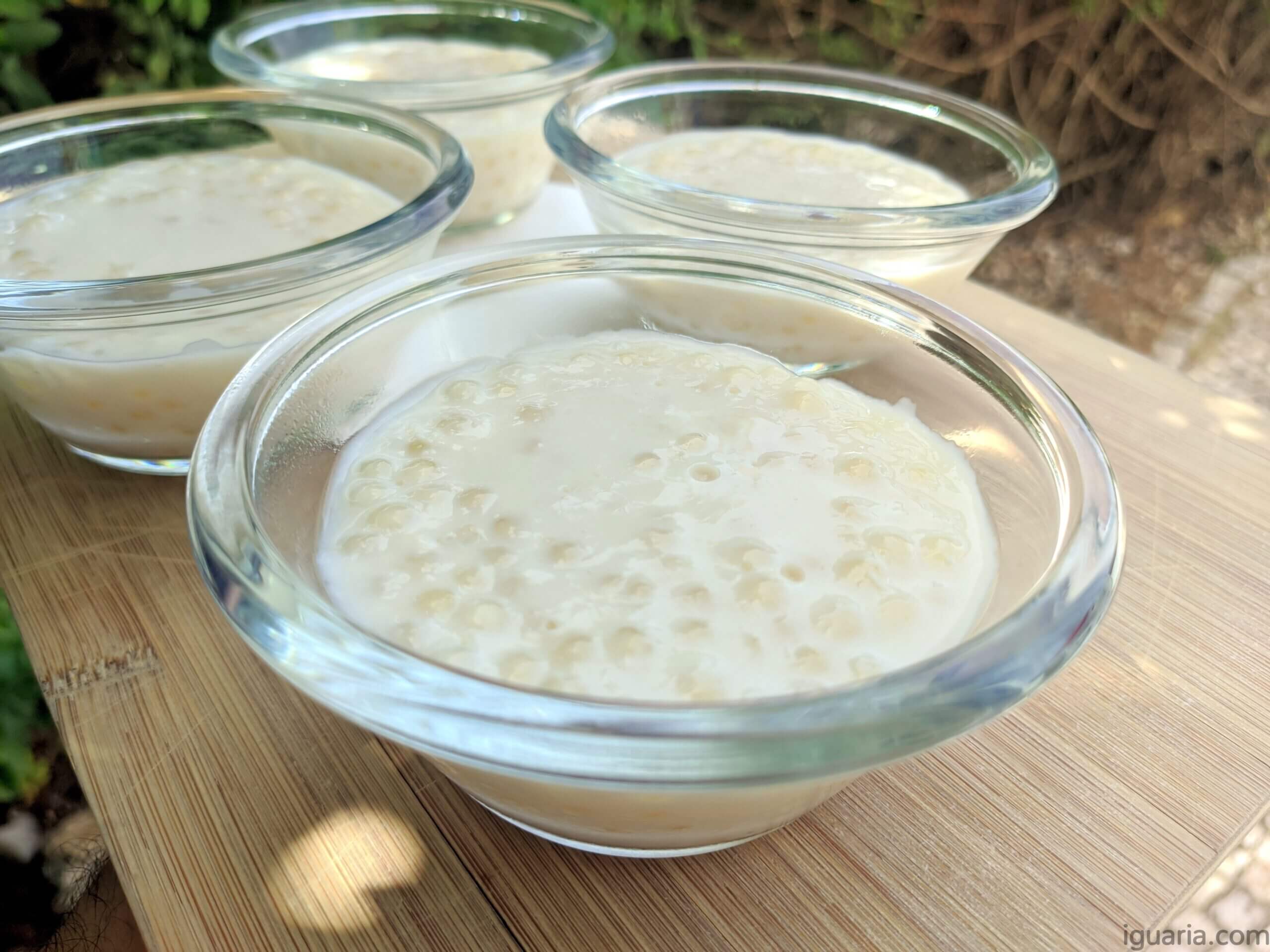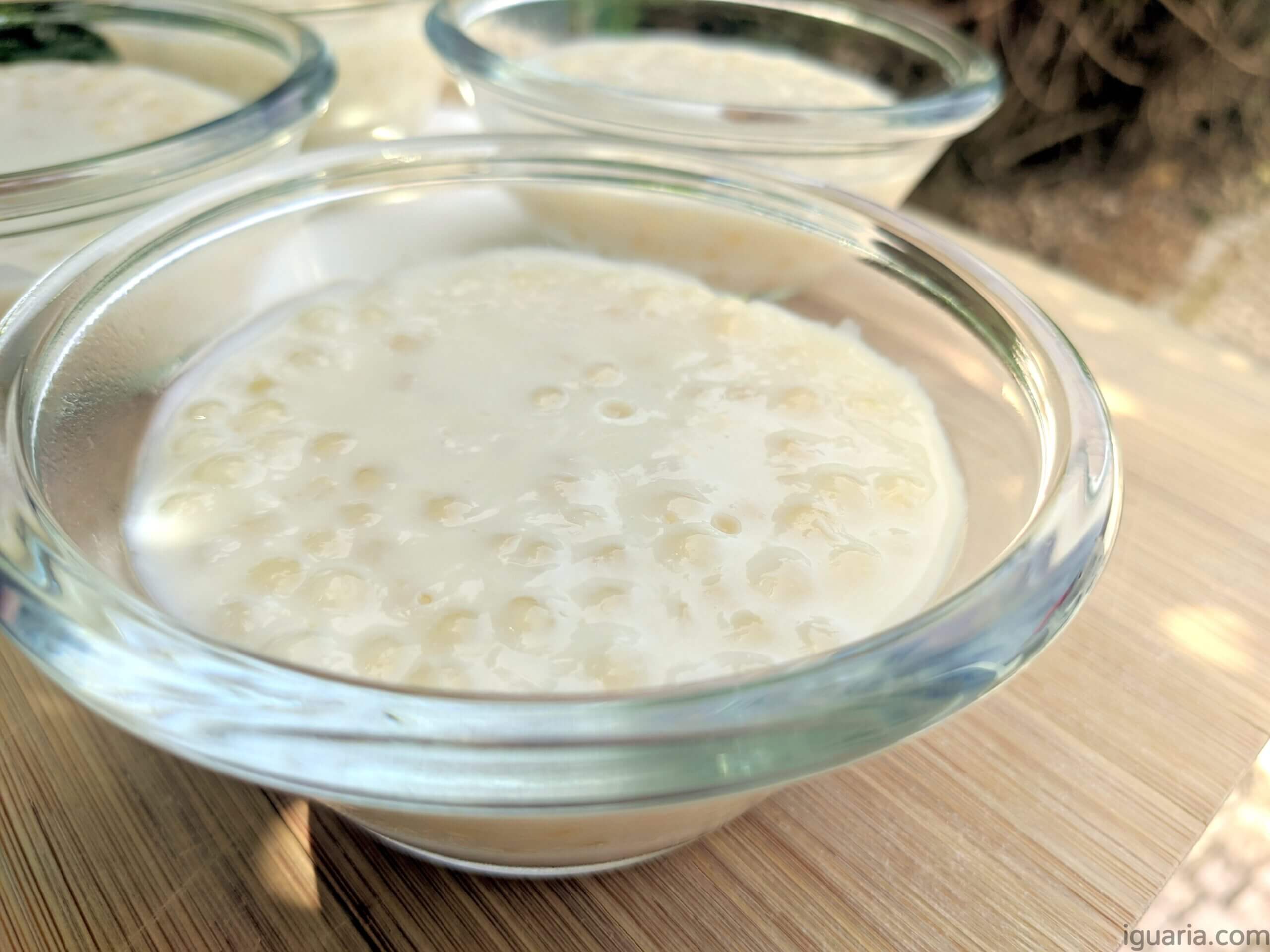 É mesmo importante deixar a tapioca hidratar bem no leite. Se não tiveres tempo de deixar de um dia para outro, pelo menos 4 horas é o mínimo, mas quanto mais tempo melhor para uma textura perfeita.